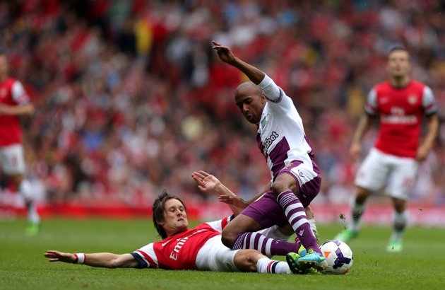 | Delph khiến các tiền vệ của Arsenal phải tắt điện. |