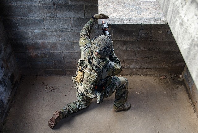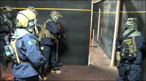 HRT có những “căn nhà bắn súng” đặc biệt. Đây là nơi học viên rèn luyện kỹ năng di chuyển qua các phòng được coi là chướng ngại vật. Người hướng dẫn sẽ quan sát và đánh giá họ khi đứng trên cao. |