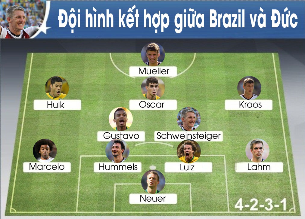 | Đội hình kết hợp giữa Brazil và Đức theo sơ đồ chiến thuật 4-2-3-1. |