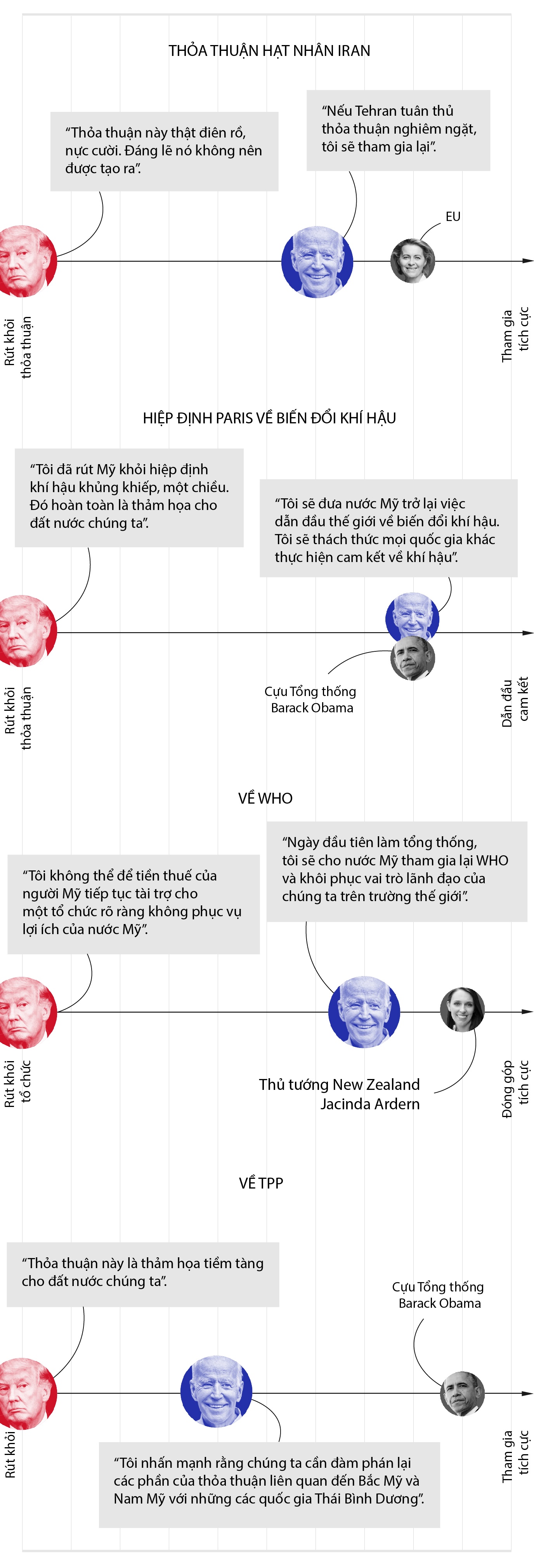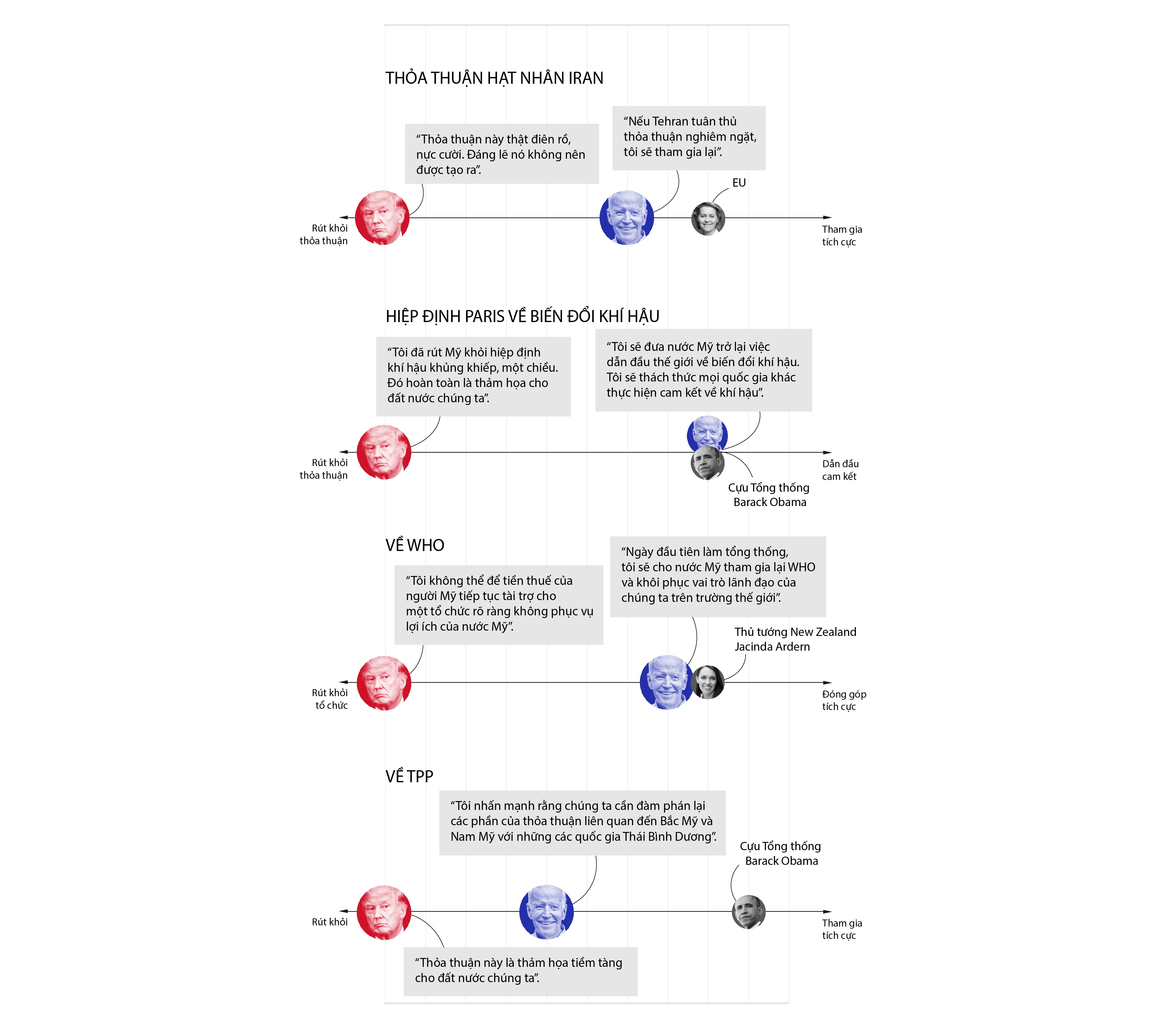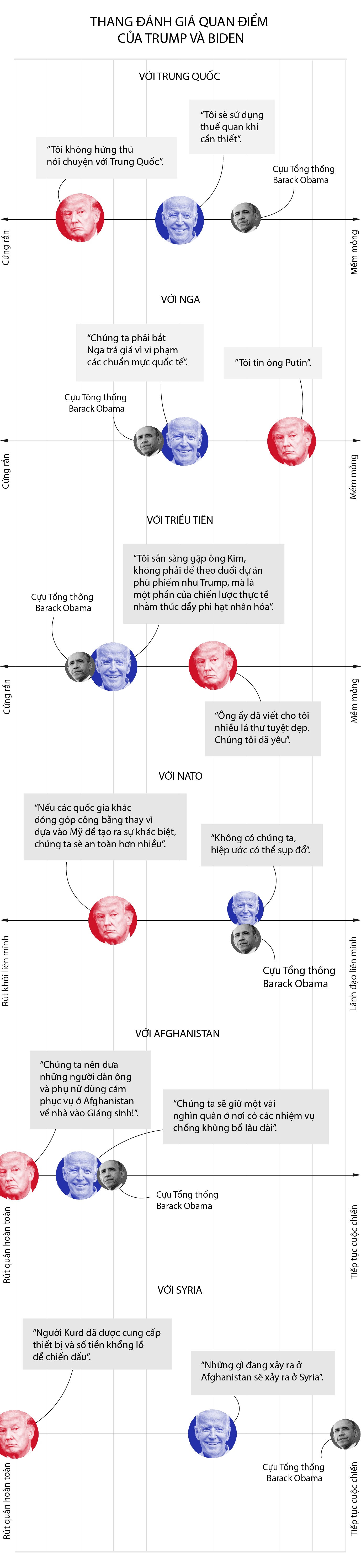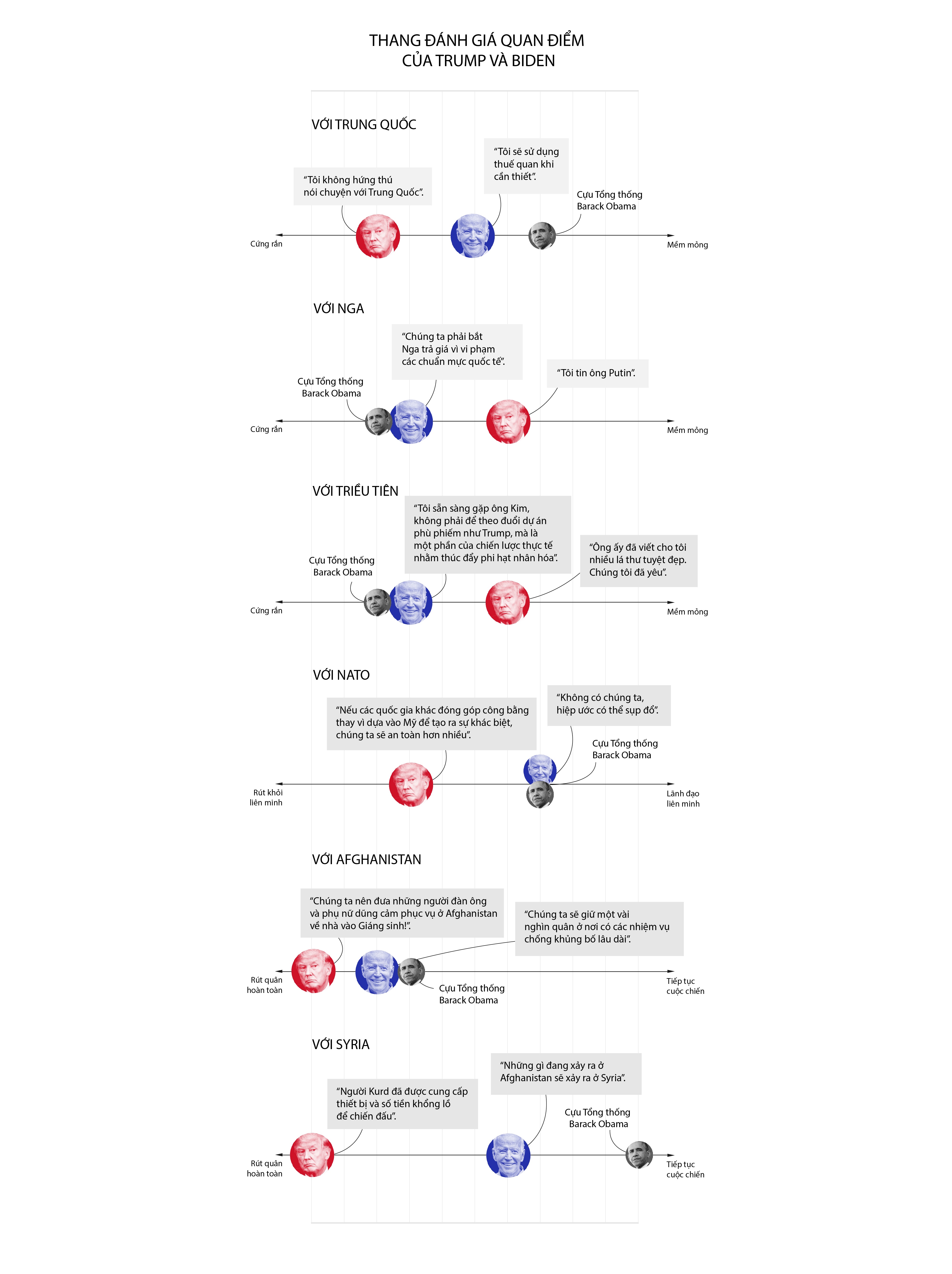 Trong vấn đề đối ngoại, các quan điểm mà các ứng viên đang hứa hẹn không chỉ thể hiện sự khác biệt ý thức hệ của hai đảng, mà còn phản chiếu mối quan ngại của nước Mỹ về một thế giới đang thay đổi, như việc ông Trump rút nước Mỹ ra khỏi các định chế đa phương, hoặc ông Biden cứng giọng hơn với Trung Quốc.