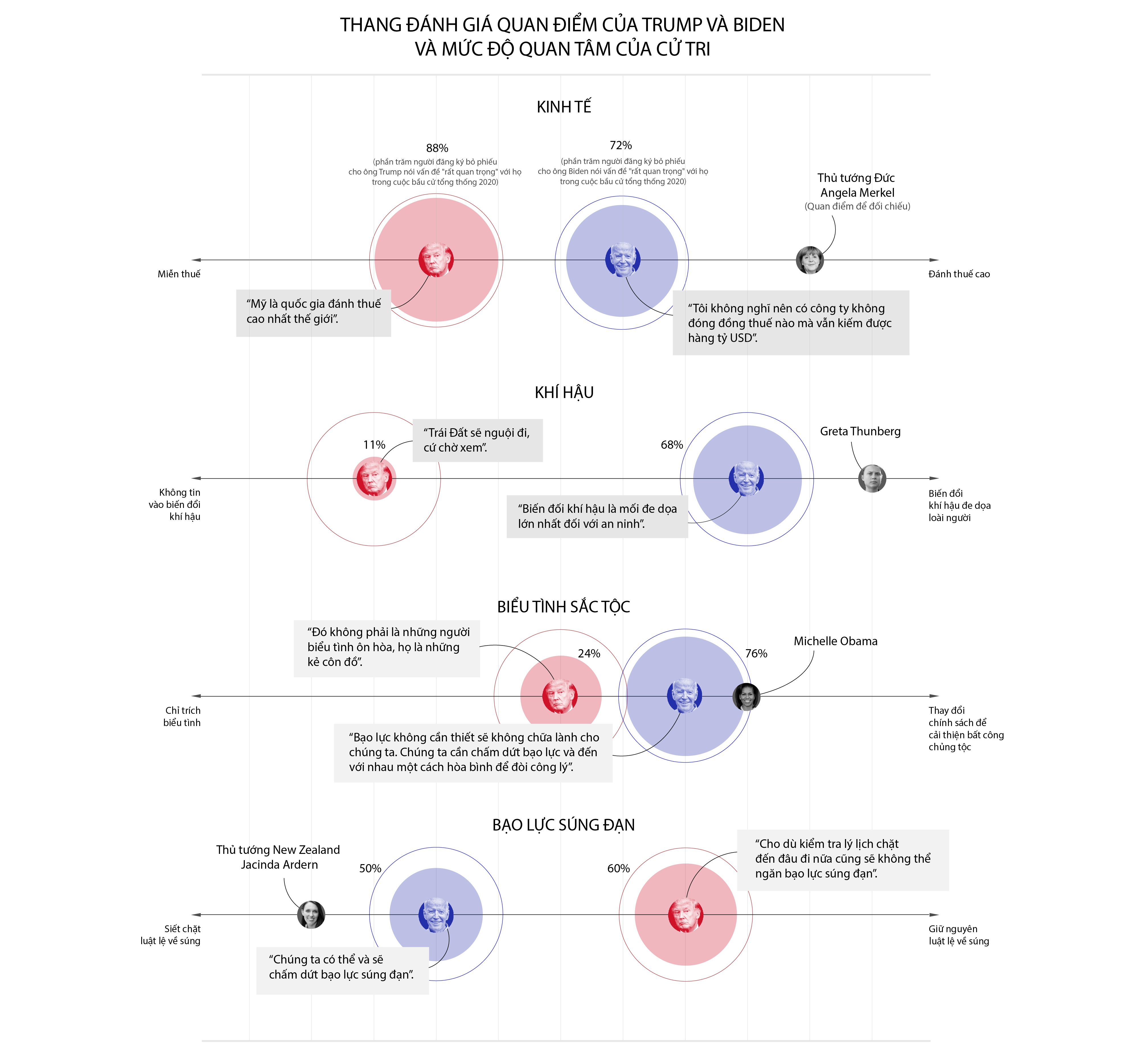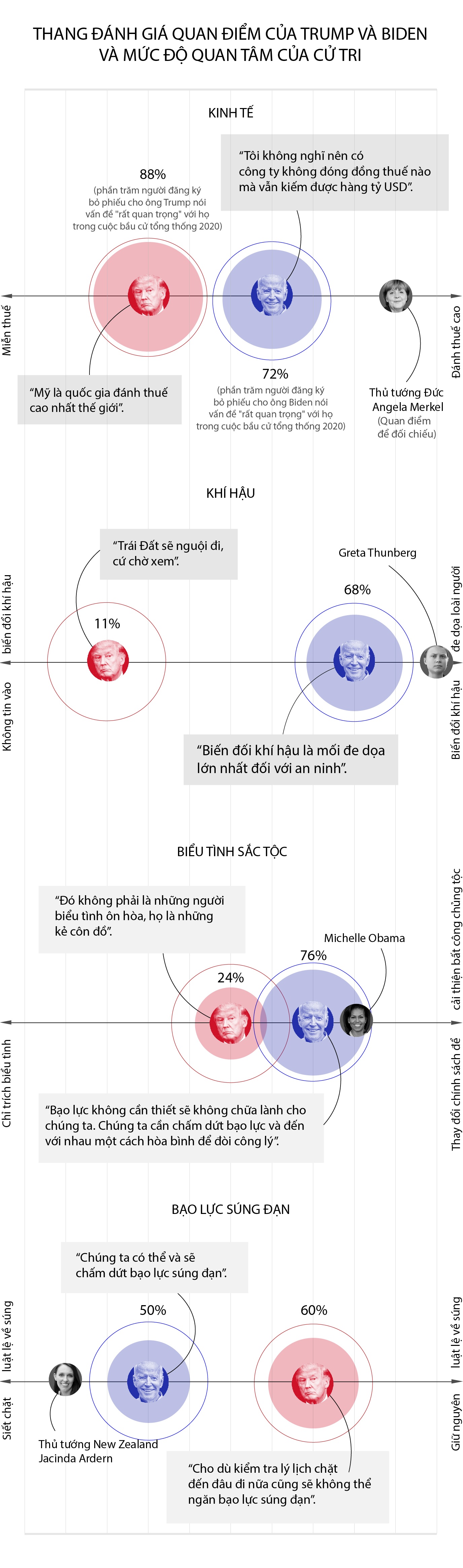 Đôi khi, sự khác biệt của hai ứng viên không chỉ bởi đảng phái mà còn tương ứng với sự quan tâm của các nhóm cử tri đối với vấn đề cụ thể. Đơn cử, trong khi Tổng thống Trump thường tỏ ra hoài nghi việc biến đổi khí hậu, các cử tri của ông cũng cho thấy họ không xem đây là một ưu tiên của kỳ bầu cử: chỉ 11% cử tri ông Trump xem trọng việc ứng phó với biến đổi khí hậu, so với 68% cử tri bên phía ông Biden.