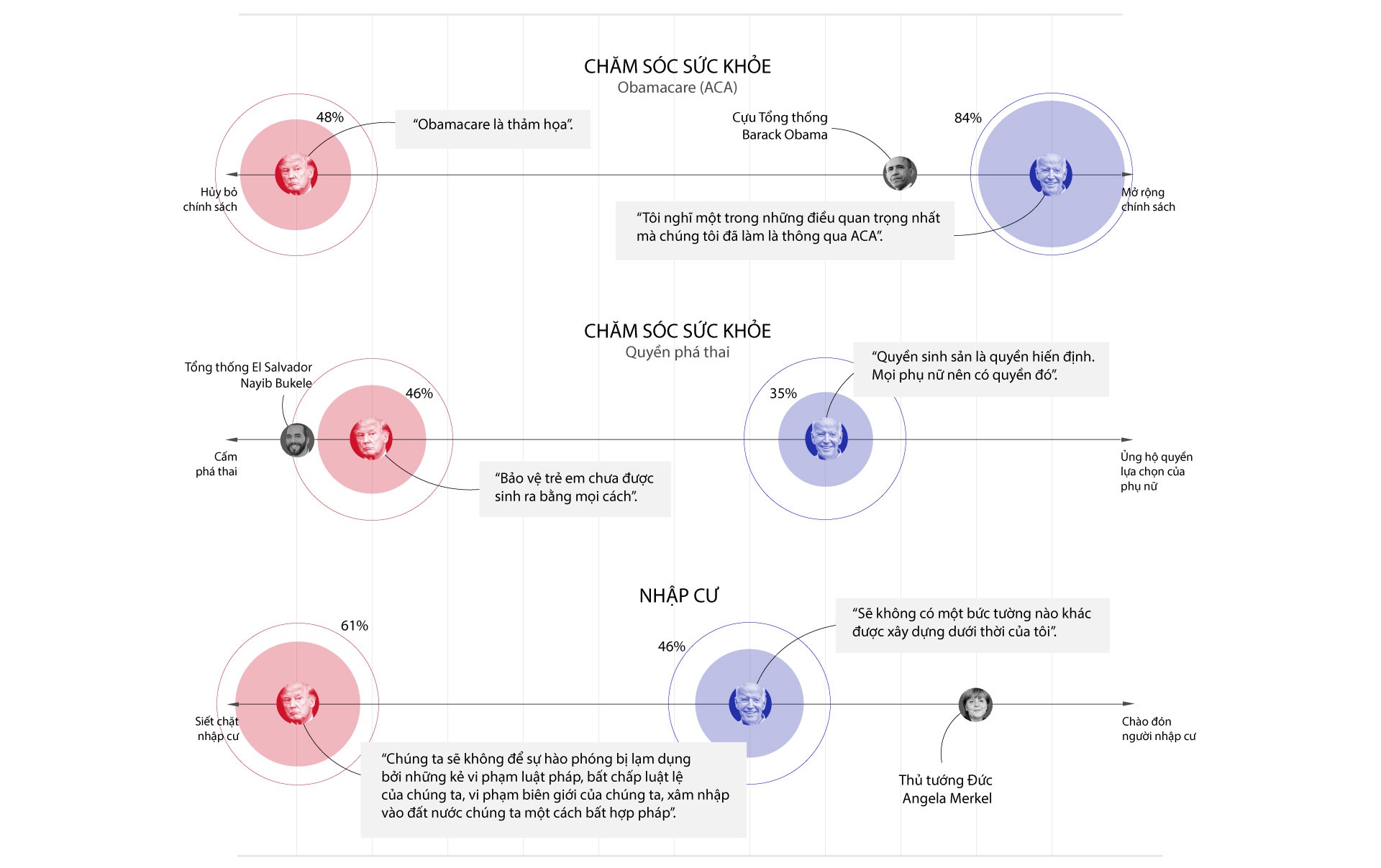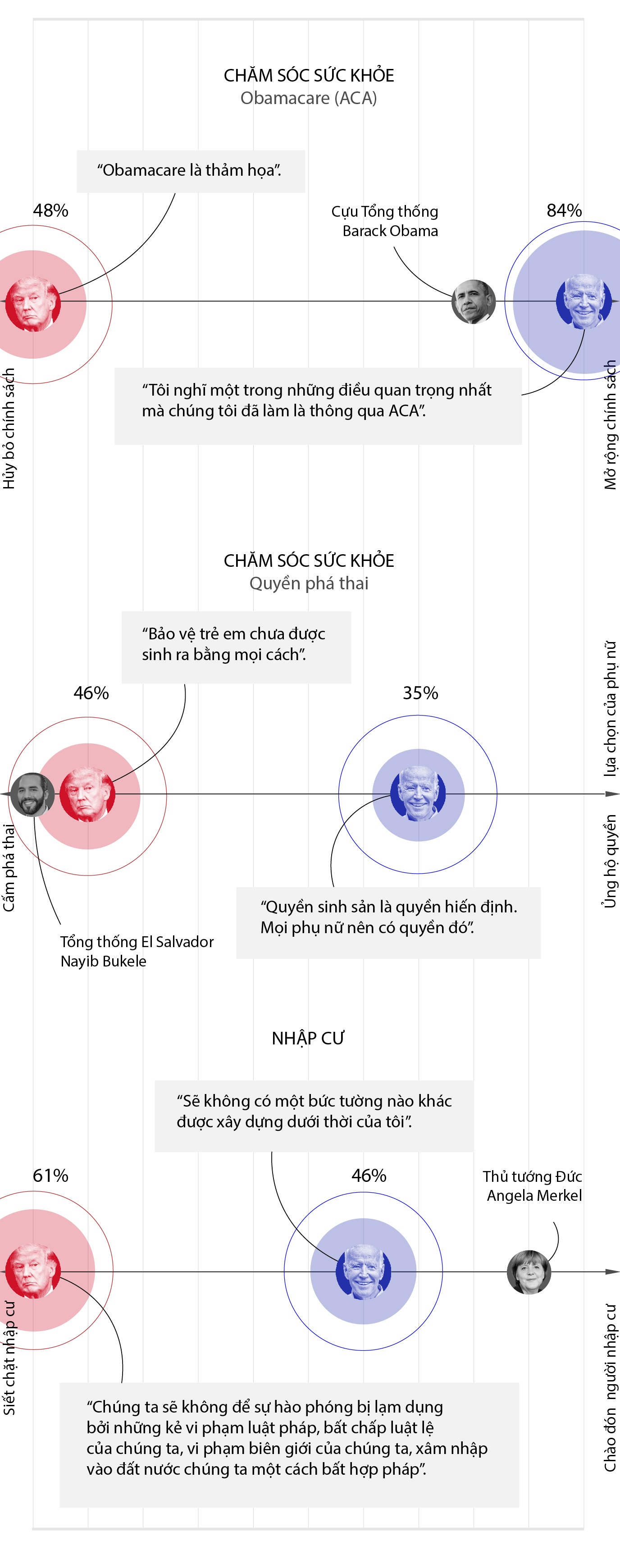 Trong khi đó, cựu Phó tổng thống Biden đề cao các giá trị truyền thống của đảng Dân chủ như quyền chăm sóc sức khỏe cho toàn dân, tự do lựa chọn của phụ nữ trong việc phá thai, mở rộng quyền nhập cư...