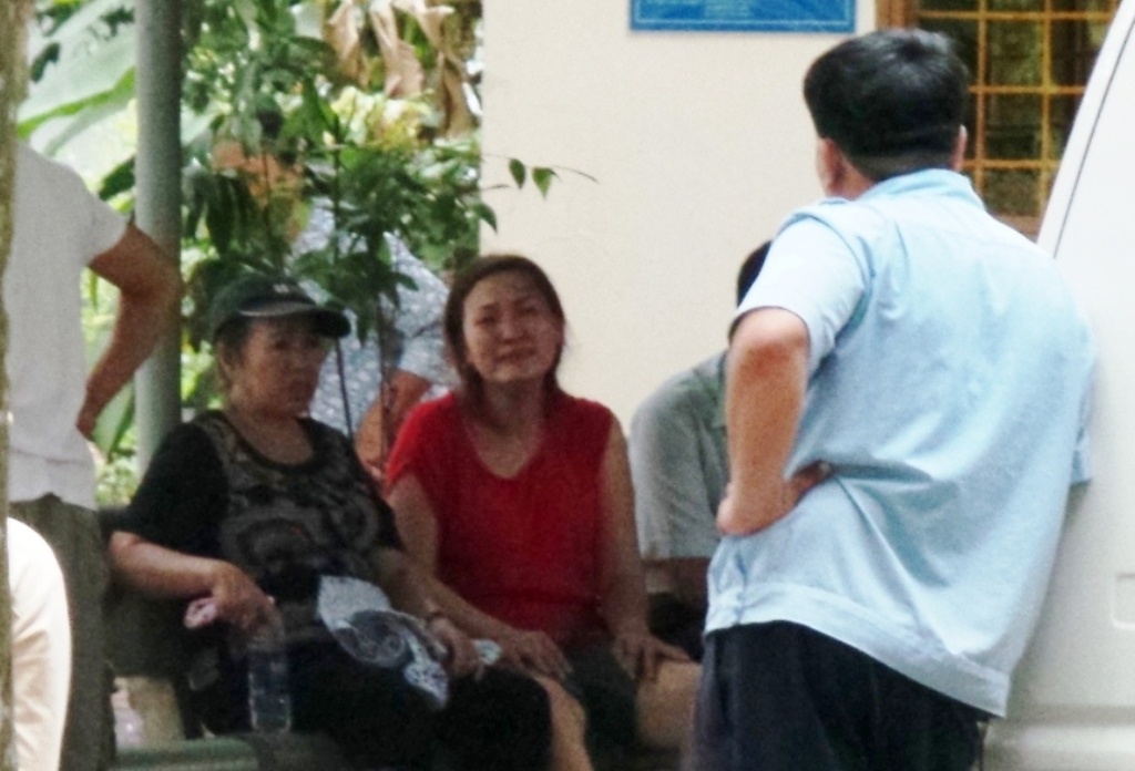 | Vợ ông Tú (áo đỏ) có mặt khá sớm tại hiện trường, sau đó đến bệnh viện. Bà liên tục khóc ngất trước cái chết của chồng. Bà cho biết, ngày 14/8 liên tục gọi cho chồng và Thời nhưng không liên lạc được. Đến chiều tối, bà tiếp tục gọi vào số Thời thì có đổ chuông nhưng không ai bắt máy. Quá bất an, khuya cùng ngày, bà nhắn tin và gọi điện cho 2 người, điện thoại đổ chuông nhưng vẫn không có người trả lời. Đến sáng thì công an gọi cho bà thông báo về cái chết của chồng. |
