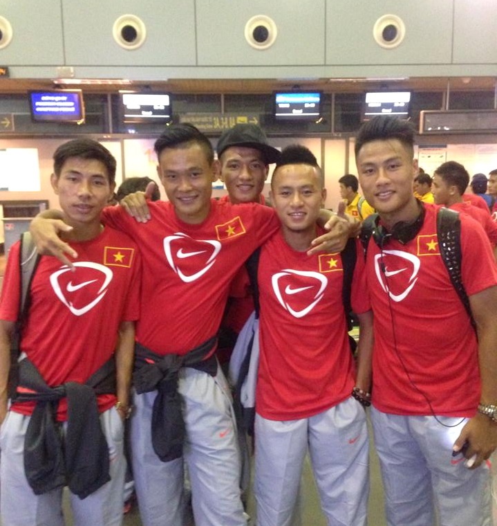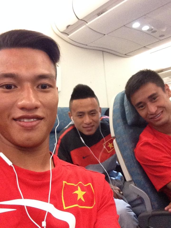 | Tiền đạo Vũ Minh Tuấn cùng các đồng đội khoe ảnh khi vừa tới Inchoen, Hàn Quốc. Thời gian bay từ Hà Nội tới thành phố đăng cai Asiad 17 kéo dài hơn 4 tiếng. |