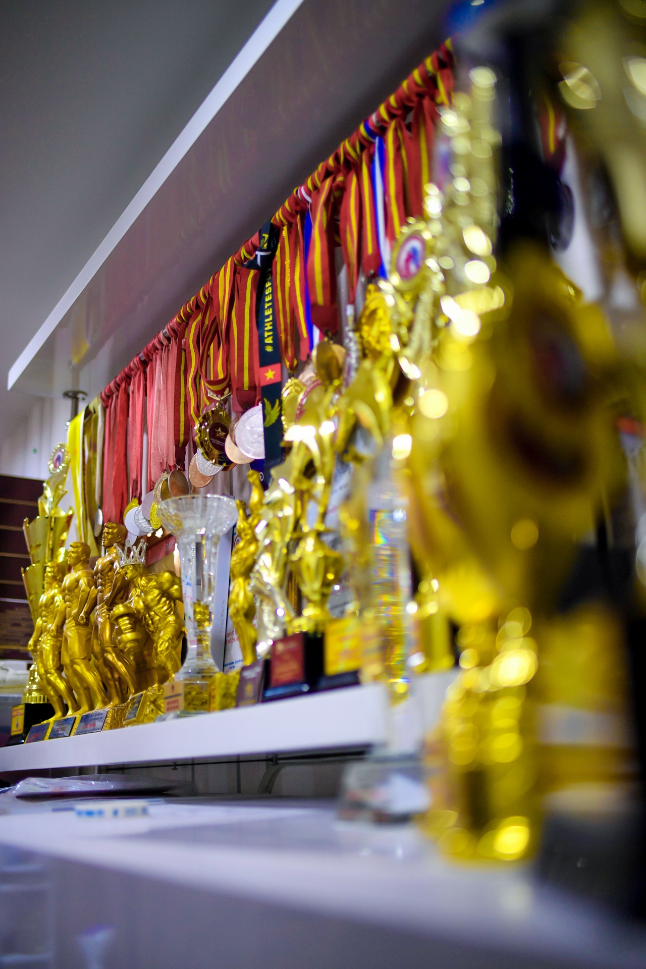 | Một góc trong phòng riêng là nơi trưng bày những chiếc huy chương và cúp mà hai đứa giành được. Tôi tập luyện, thi đấu thể thao từ năm 4 tuổi và có khá nhiều giải thưởng. |