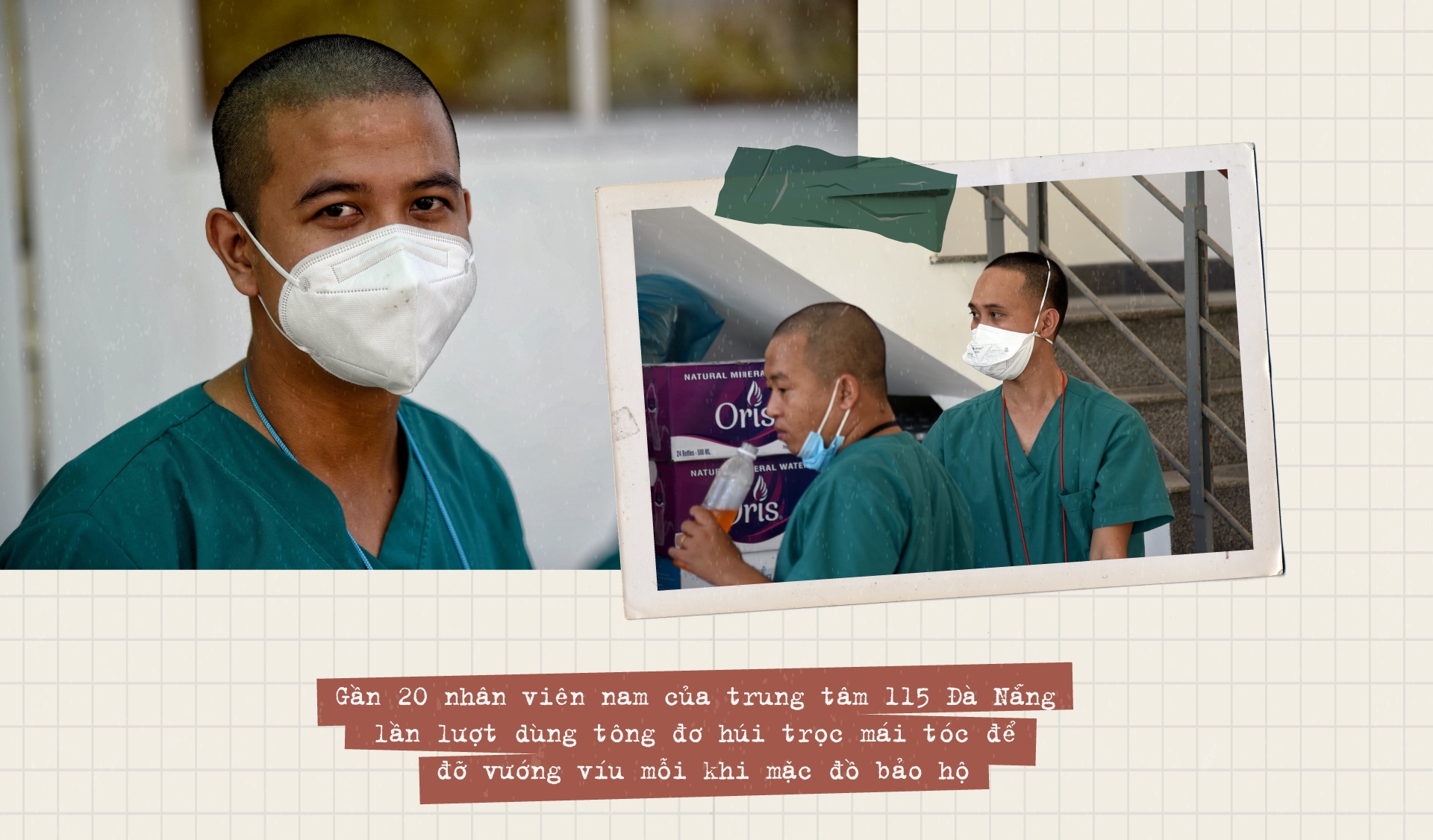 Khi dịch bùng phát ở Đà Nẵng, gần 20 nhân viên nam của trung tâm 115 Đà Nẵng lần lượt dùng tông đơ húi trọc để đỡ vướng víu mỗi khi mặc đồ bảo hộ. Ban đầu họ chỉ định cắt ngắn còn 3 phân cho gọn gàng, nhưng những đôi tay chưa bao giờ dùng tông đơ tạo ra quá nhiều vết lẹm đến sát chân tóc. “Thôi ủi trọc luôn cho nhanh”, y sĩ Nguyễn Trung kể.