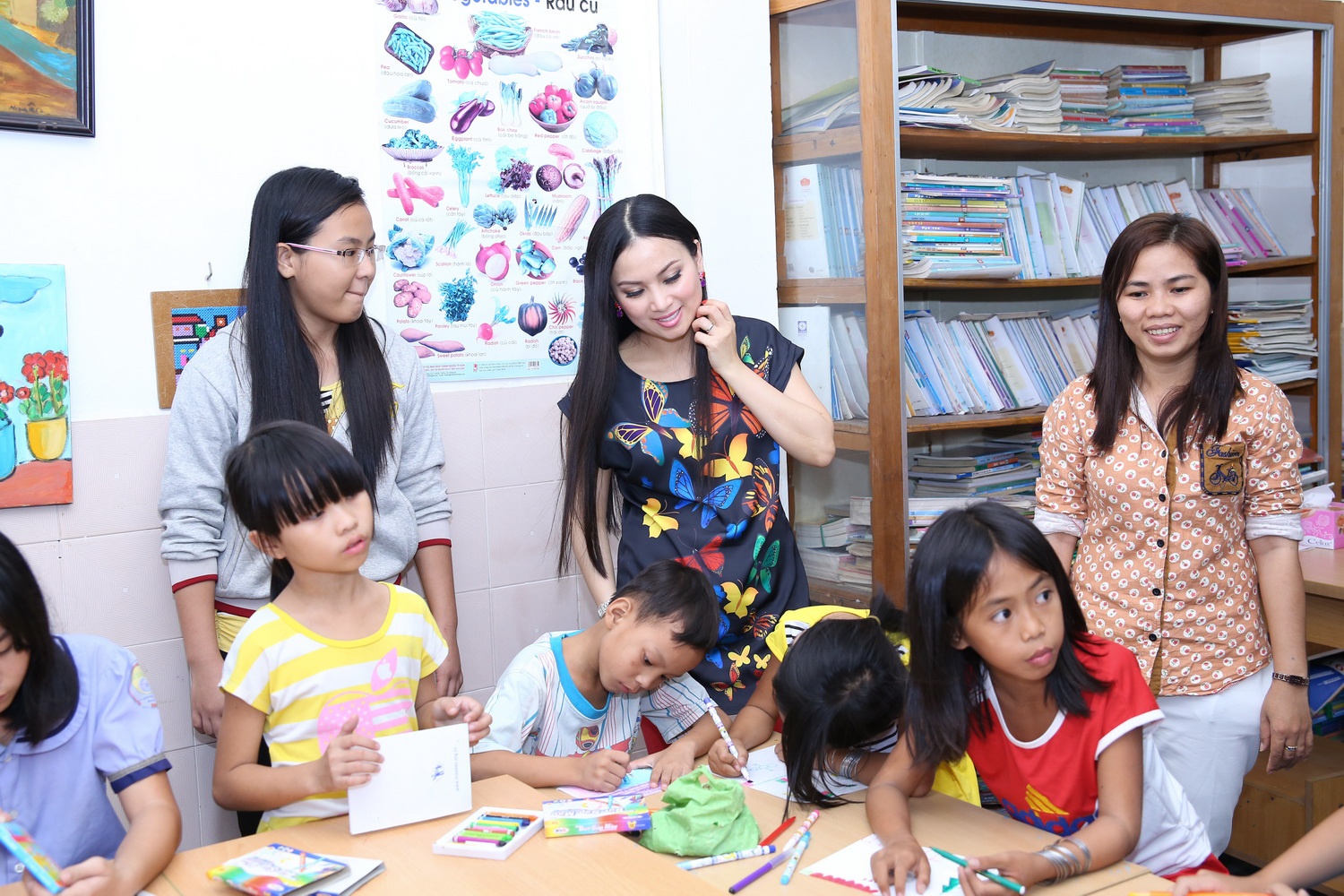 Nữ ca sĩ bình dị ngay cả trong việc không ngại ngần ngội bệt xuống đất để cùng trò chuyện, vui đùa, lắng nghe các em kể chuyện.
