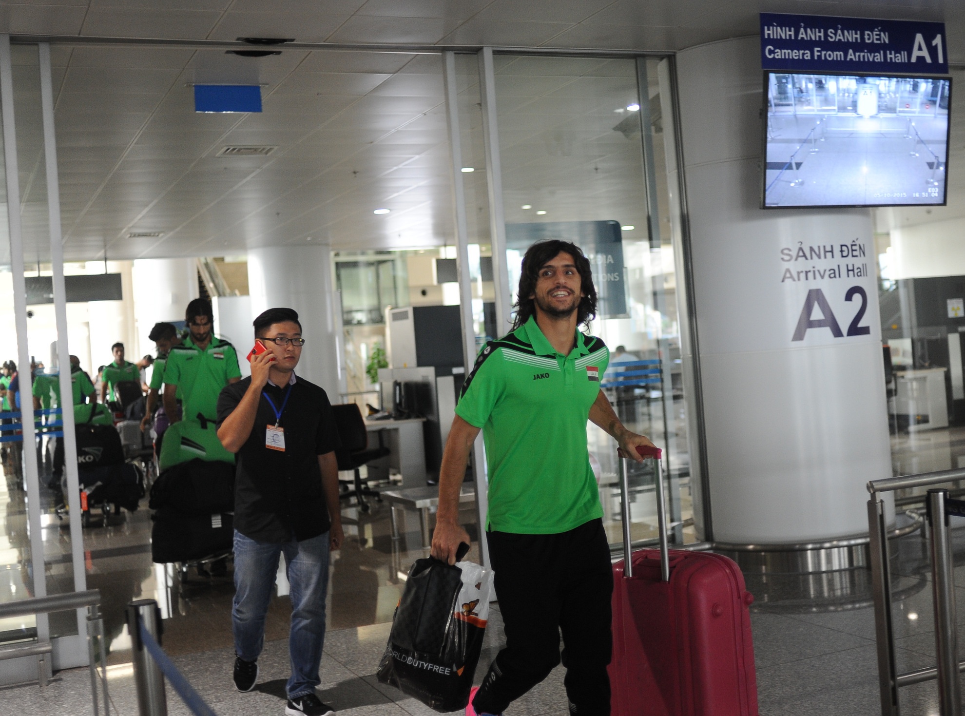 | Trước đó, máy bay chở đội tuyển Iraq từ Bangkok hạ cánh xuống sân bay Nội Bài (Hà Nội) lúc 15h10, nhưng họ phải chờ gần 2 giờ đồng hồ để làm thủ tục xin visa nhập cảnh vào Việt Nam. Các cầu thủ tỏ ra khá mệt mỏi vì sự chờ đợi này. |