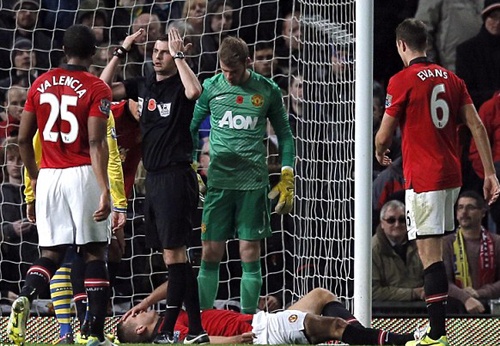 | Vidic đau đớn sau pha va chạm với thủ thành De Gea. |