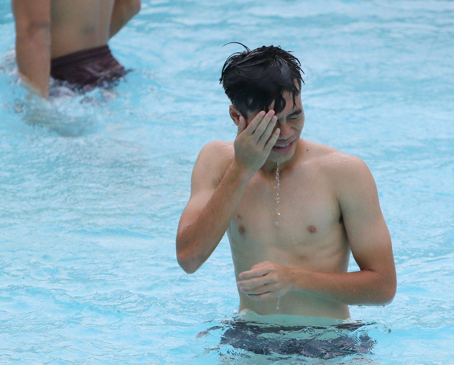 | Văn Toàn phải "đầu hàng" trước màn té nước tới tấp của Ngọc Hải. |