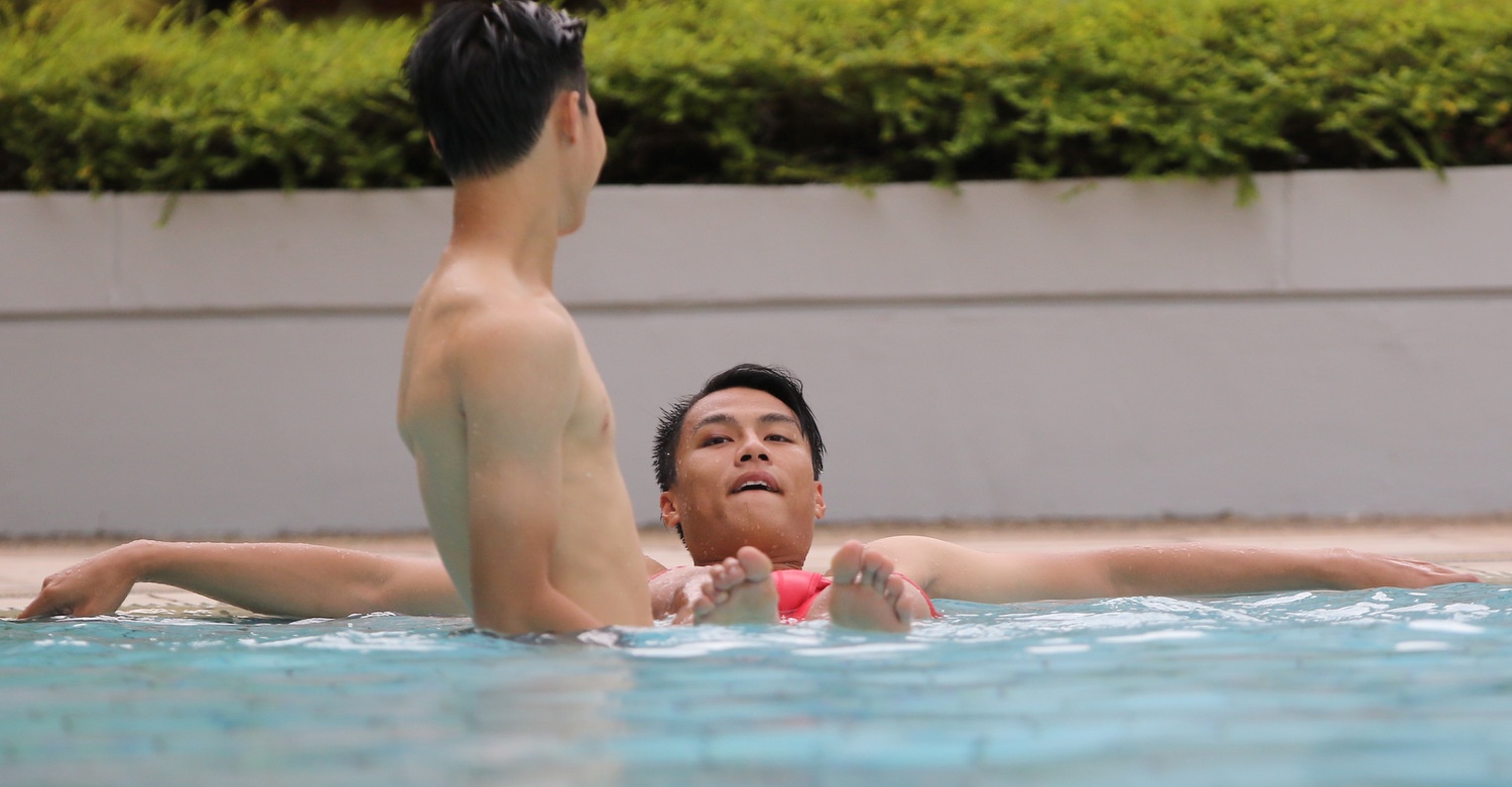 | Ở một góc bể bơi, Huy Toàn - cầu thủ đá chính 90 phút trong trận gặp Thái Lan nô đùa với Hồng Quân. |