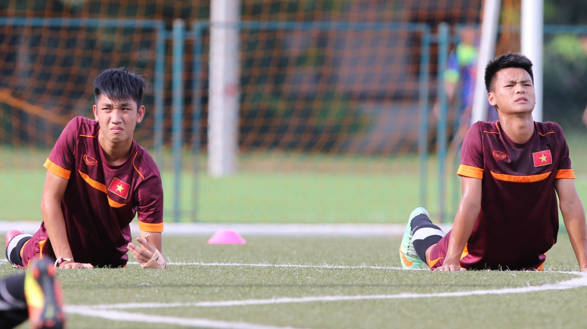 | Ở phần căng cơ đầu buổi tập, Trọng Đại không thể chống tay xuống đất thực hiện động tác giống như các đồng đội. |
