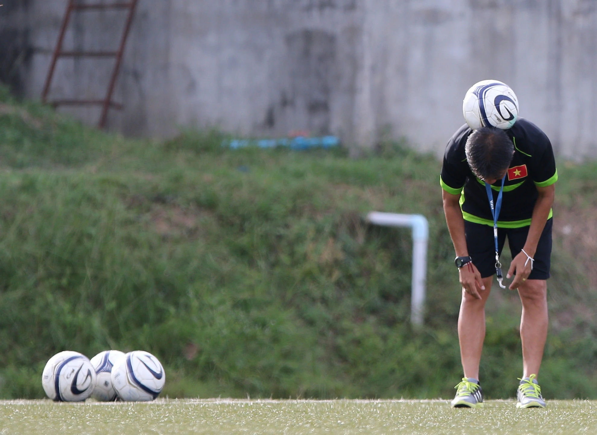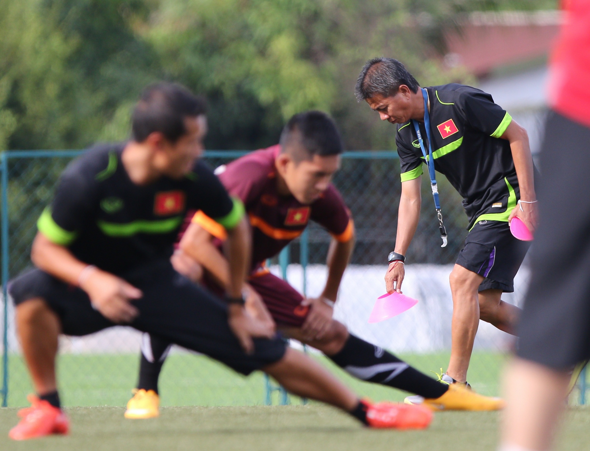 | Trong khi các học trò khởi động, HLV Hoàng Anh Tuấn tỉ mỉ xếp chướng ngại vật nhằm chuẩn bị cho các nội dung tập luyện tiếp theo. |