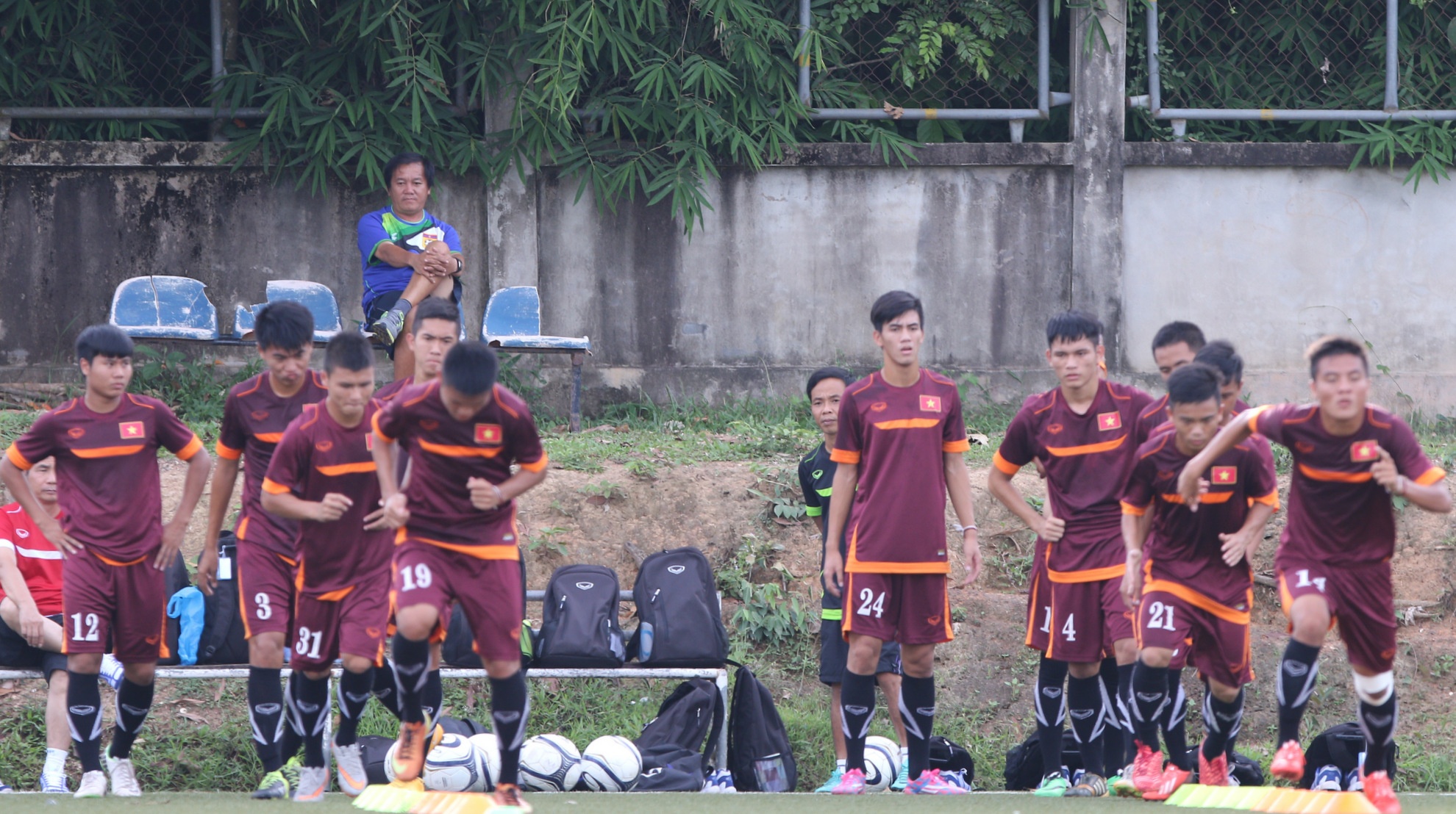 | HLV trưởng U19 Lào - ông Phan Tôn Lợi ngồi quan sát buổi tập của các cầu thủ U19 Việt Nam. |