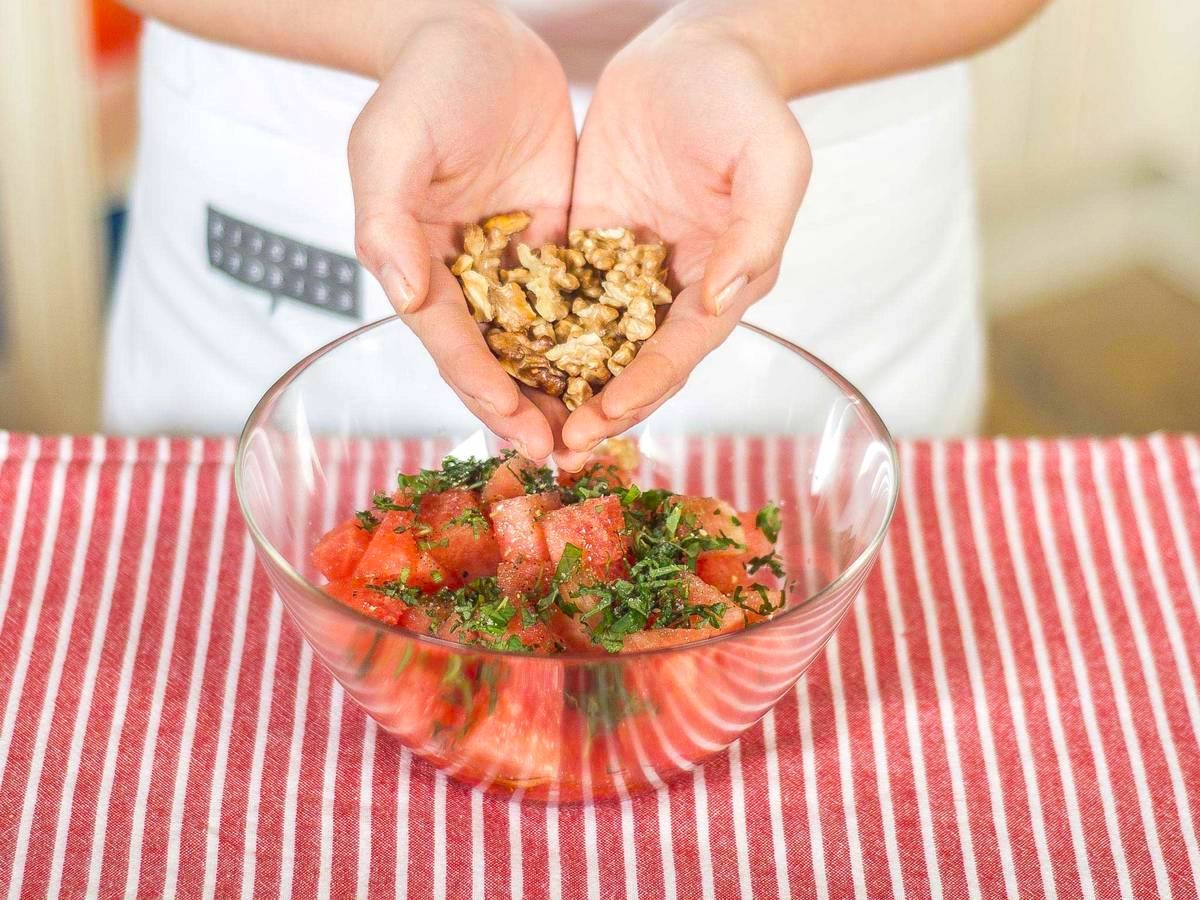 - Nhẹ nhàng bẻ đôi quả óc chó bằng tay, cho vào bát đã có dưa hấu và gia vị.