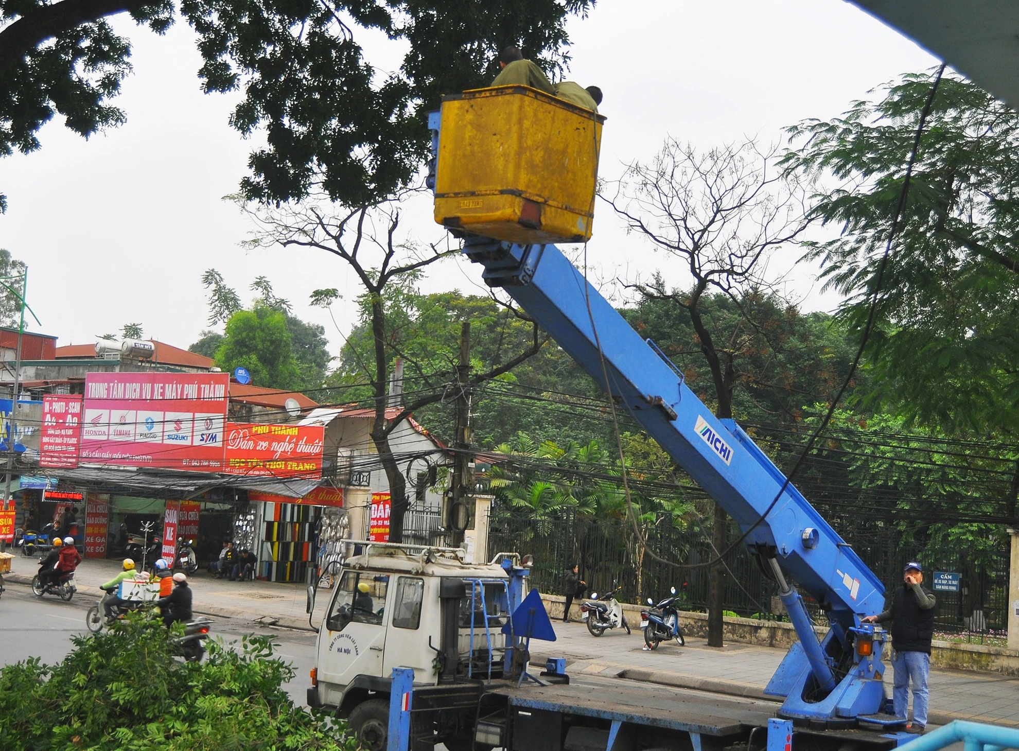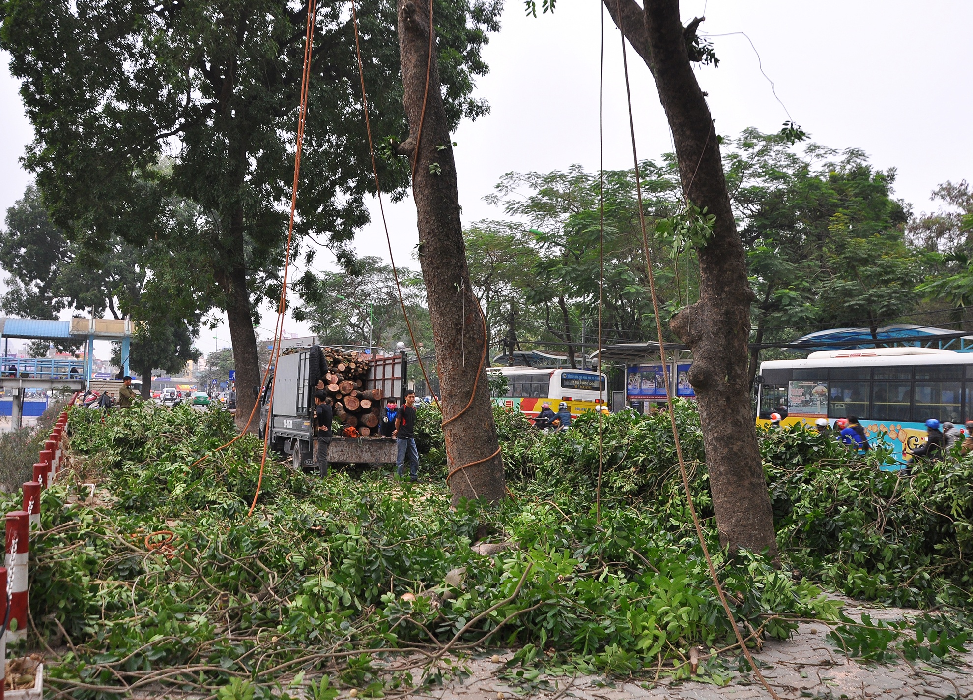 Công ty huy động một xe nâng để tháo dỡ hệ thống dây điện; 3 cưa máy cùng với hai xe tải (loại nhỏ) và khoảng 10 người phối hợp phân làn, vận chuyển cành lá.