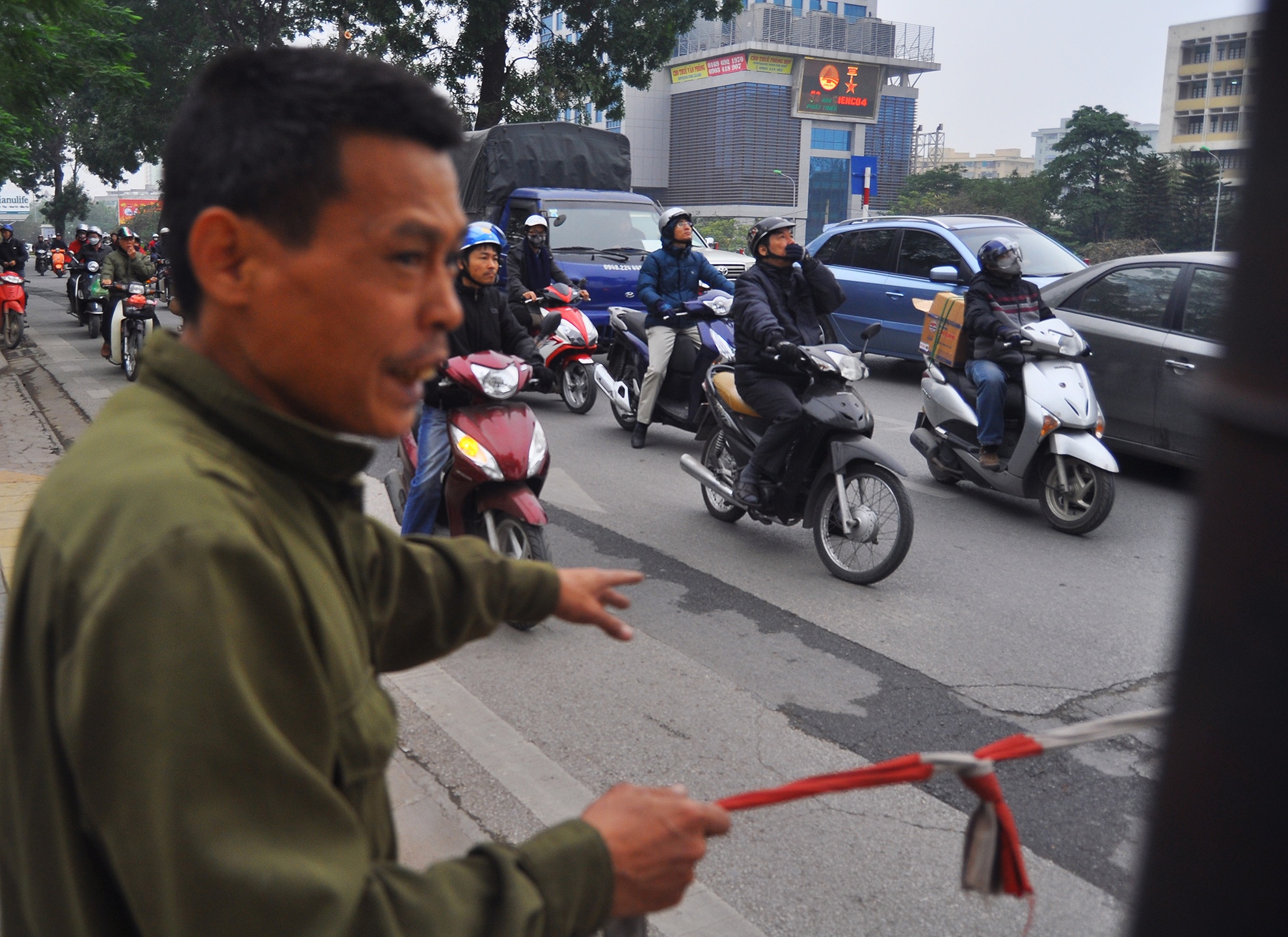 Trong quá trình đốn hạ, nhân viên Công ty cây xanh Hà Nội chăng dây phân làn các phương tiện tránh sự cố, tai nạn xảy ra. Nhiều người dân ngước lên nhìn với vẻ tiếc nuối.