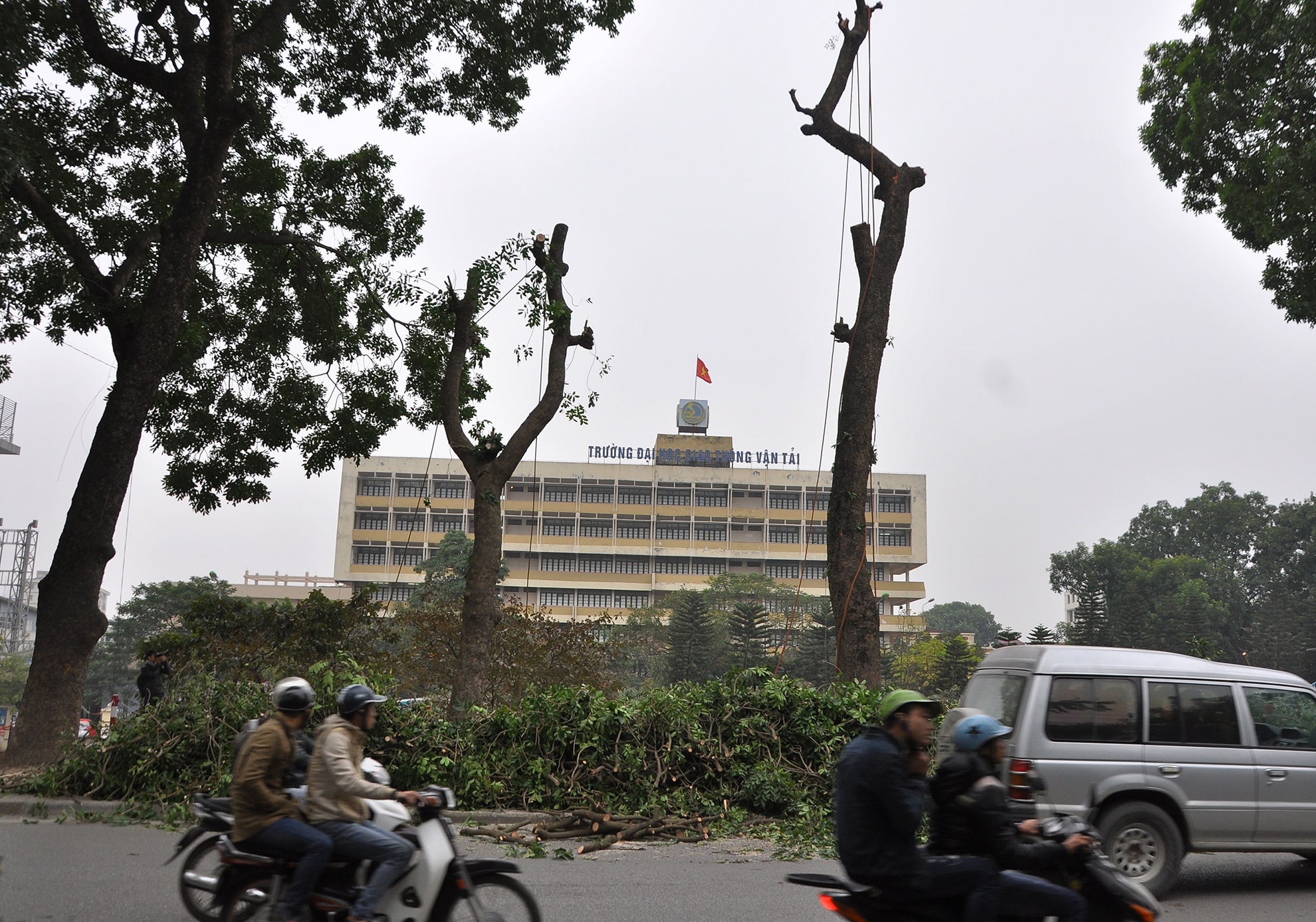 Sau khi chặt cành, cây xà cừ cổ thụ trơ trọi trước cổng Đại học Giao thông vận tải.