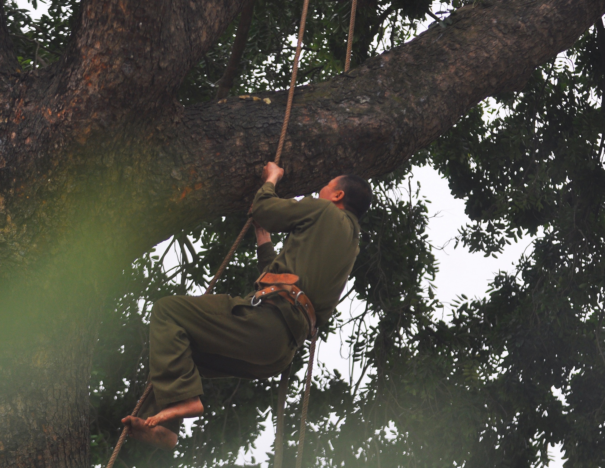 Nhân viên công ty cây xanh trèo lên cây xà cừ cổ thụ bằng cách đu dây thừng với sự hỗ trợ của những người khác.
