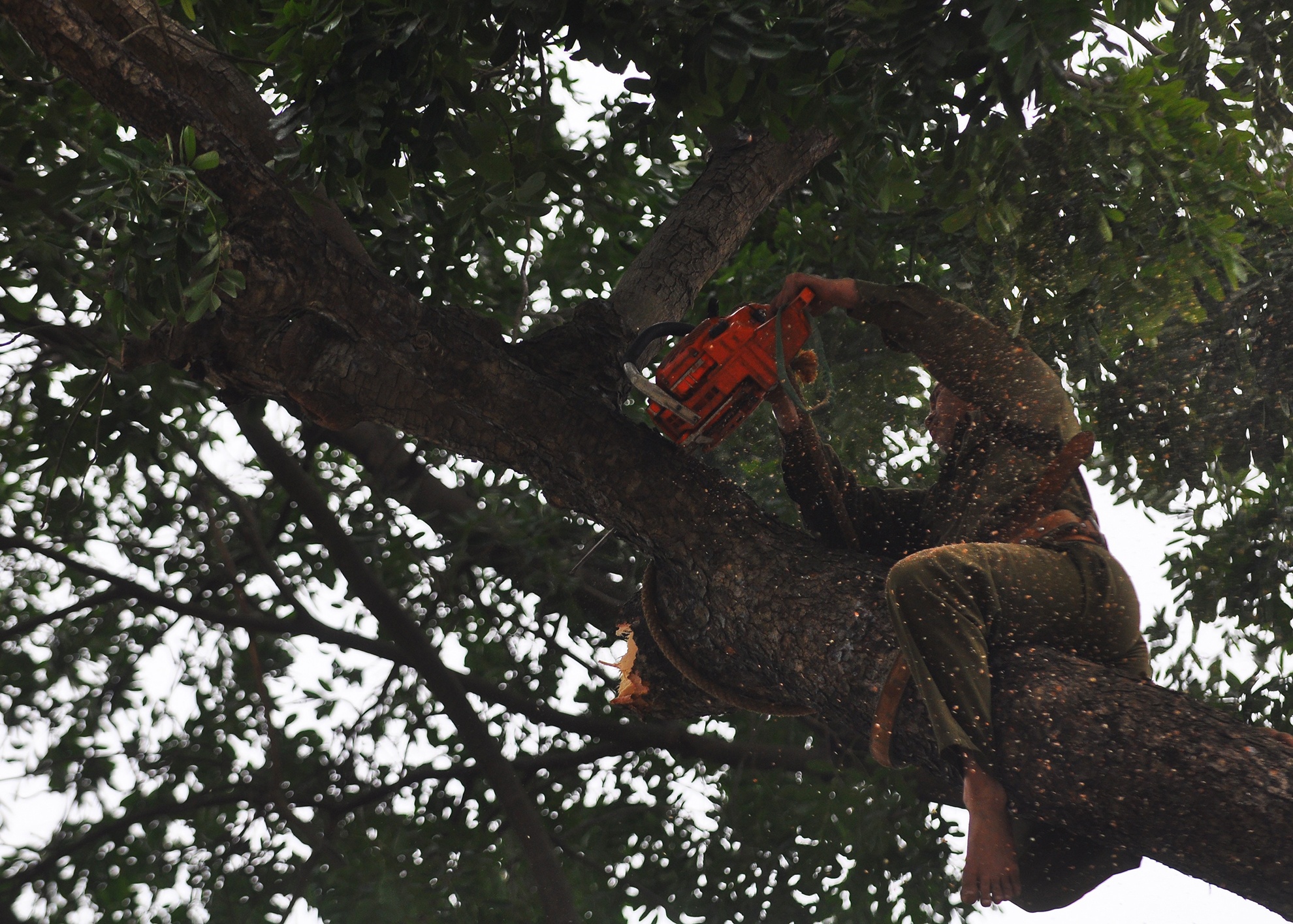 Sau đó dùng cưa máy cắt cành cây.