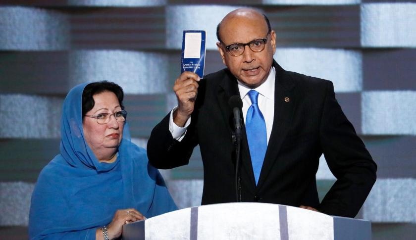 | Cha mẹ của Đại úy Humayun Khan, một binh sĩ Mỹ theo đạo Hồi đã hy sinh trên chiến trường Iraq, bị Trump chỉ trích sau bài phát biểu của họ tại Đại hội đảng Dân chủ cuối tháng 7. Ảnh: Getty. |
