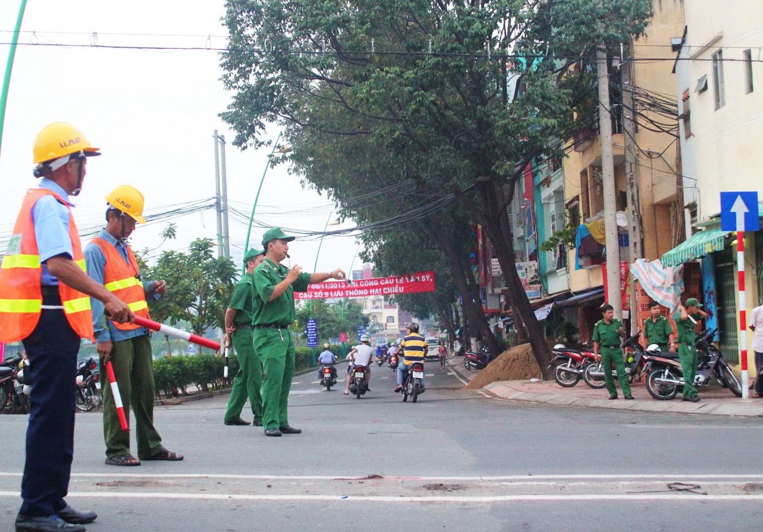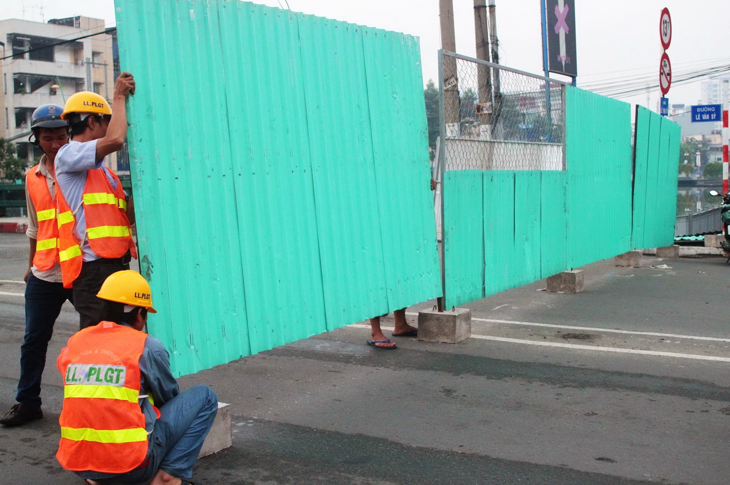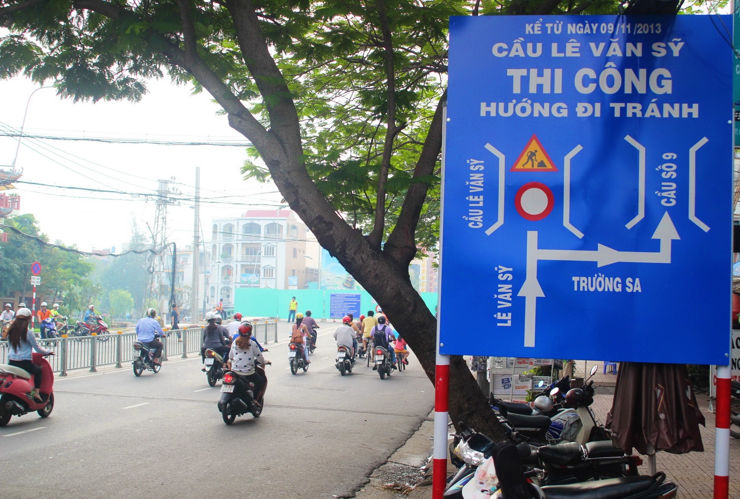 | 6h sáng, đơn vị thi công tiến hành dựng rào chắn hai đầu cầu Lê Văn Sỹ. Đây là cây cầu thứ 3 được đóng cửa để xây cầu mới sau cầu Bông (Q.Bình Thạnh-Q.1) và cầu Hậu Giang (Q.6). |