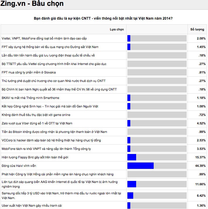 10 sự kiện này được bỏ phiếu từ 20 sự kiện đề cử. Dưới đây là kết quả tỷ lệ bầu chọn của độc giả Zing.vn.