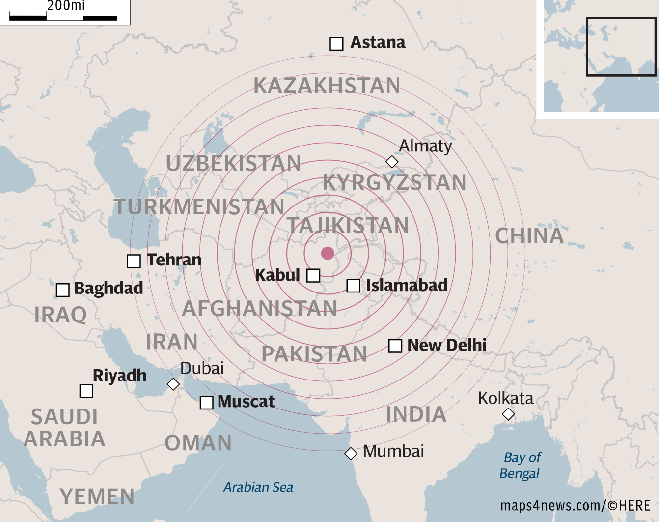 Theo USGS, tâm chấn ở vùng núi cách thị trấn Jarm, gần biên giới với Pakistan, 45 km về hướng tây nam, và có độ sâu 196 km.