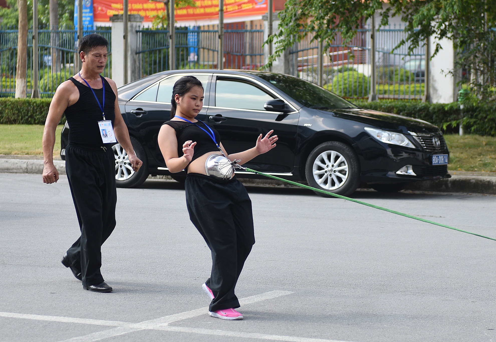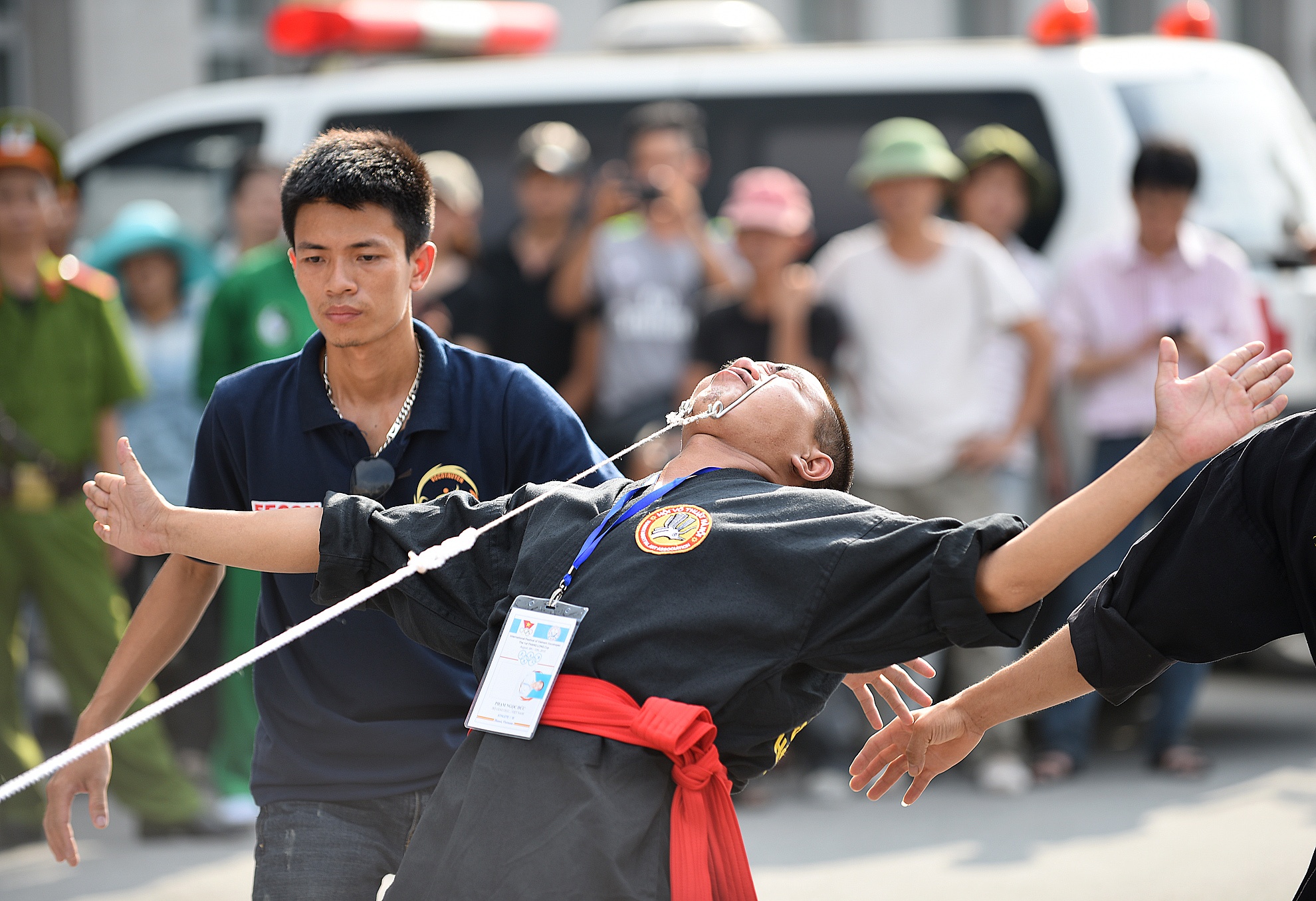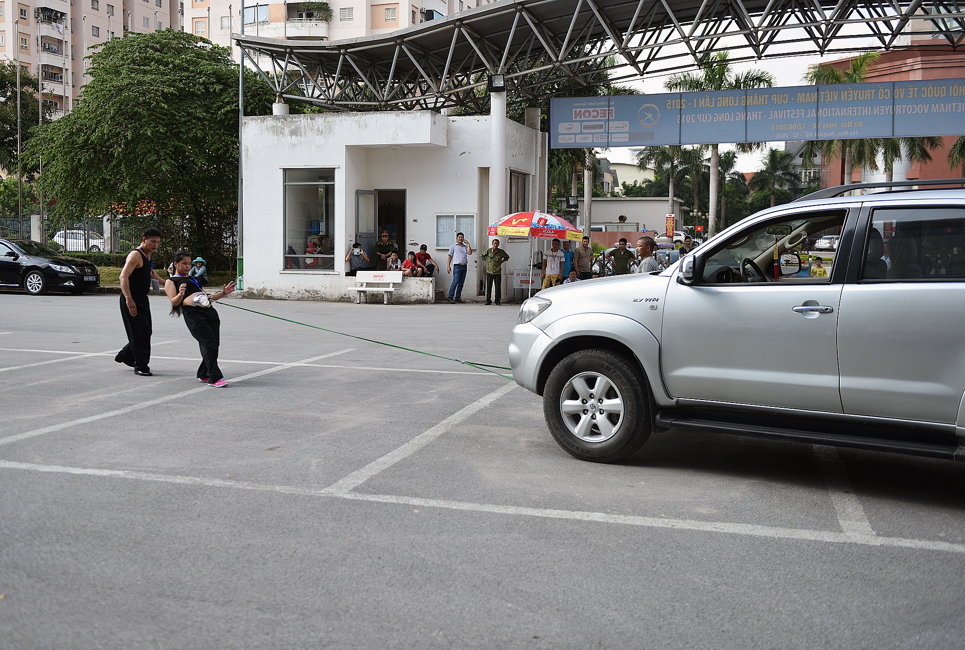 | Cũng trong chiều nay, đáng chú ý có màn trình diễn của võ sinh Nguyễn Thị Thu Huệ (15 tuổi) đến từ môn phái Duy Thắng, tỉnh Thái Nguyên. Tiết mục mang tên Bát thương thích huyệt. Huệ dùng bụng kéo xe ôtô 7 chỗ. |