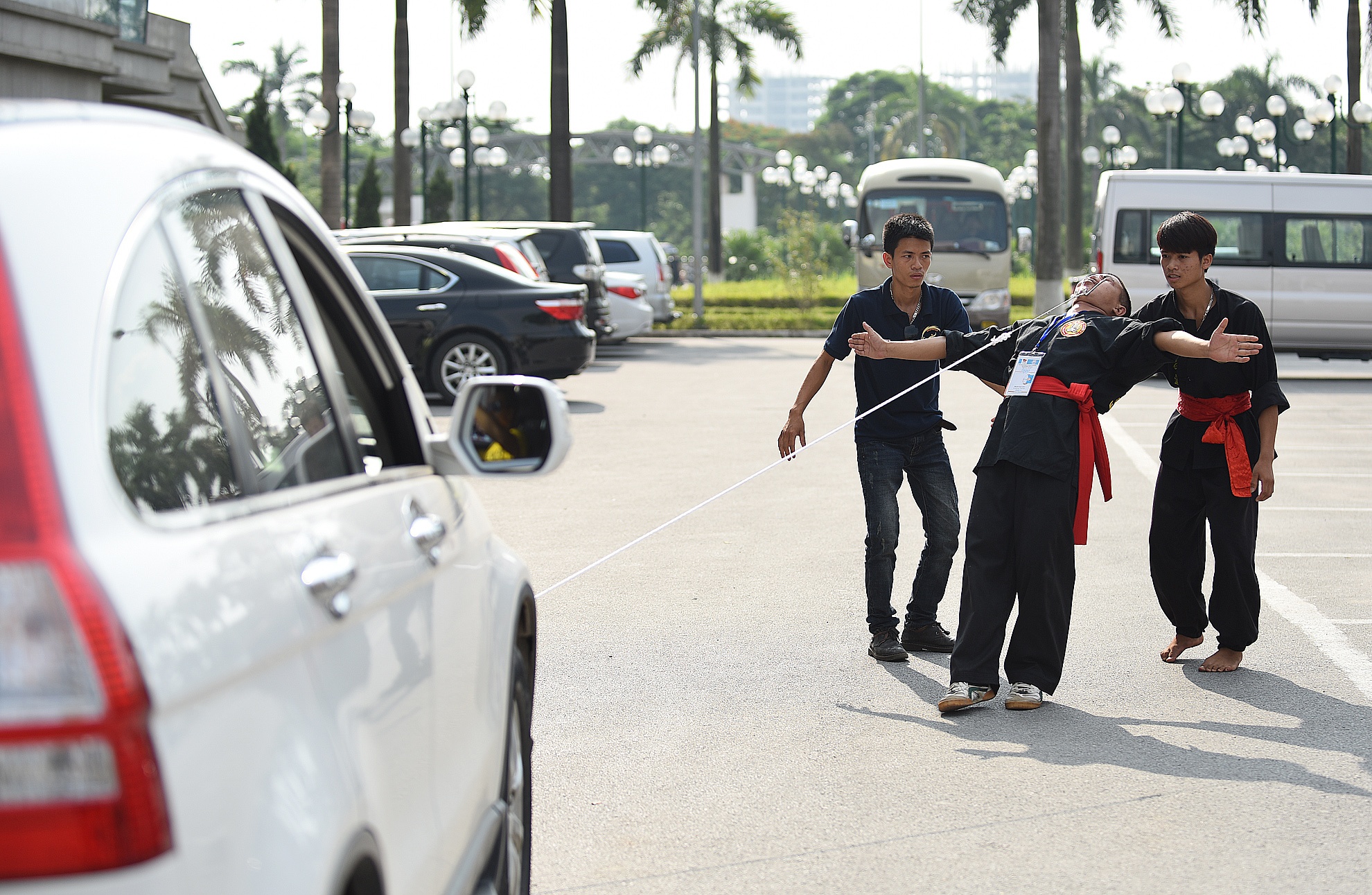 | Có 4 người để hỗ trợ người biểu diễn tiết mục này. Chiếc xe 16 chỗ, nặng 2 tấn sẽ được kéo trên quãng đường dài 20 m. |