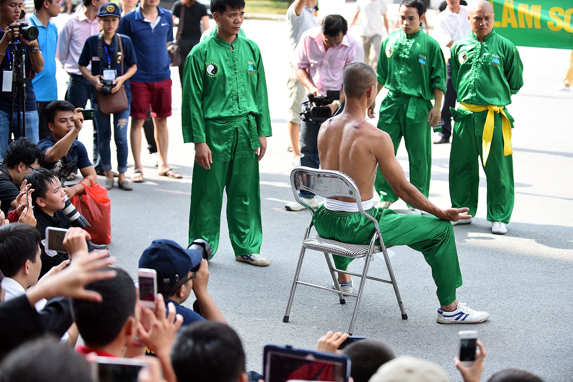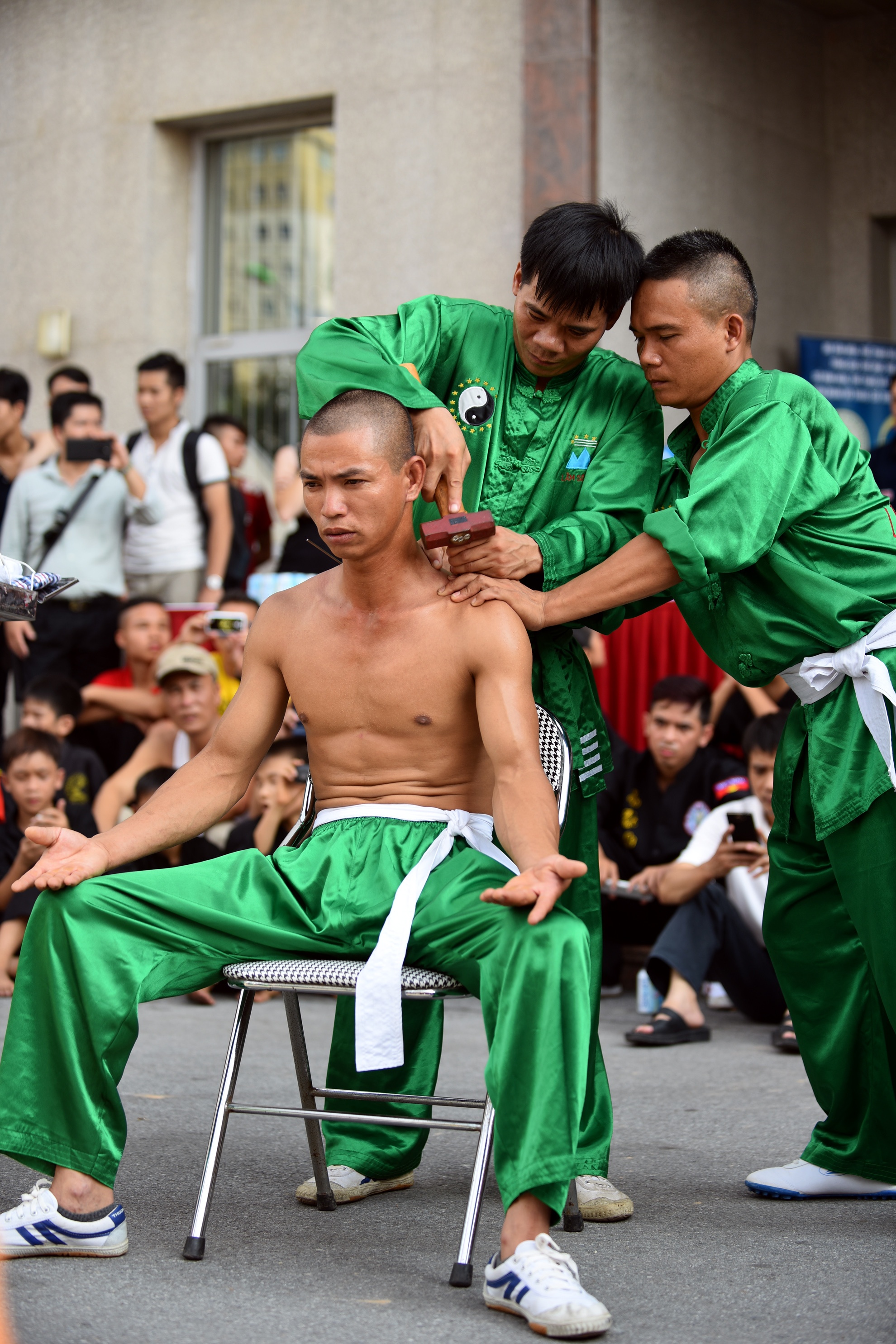 | Sau khi thực hiện xong tiết mục, võ sư đến từ môn phái Lâm sơn động ngồi nghỉ 5 phút. Sau đó anh được những người hỗ trợ rút hai chiếc đinh ra ngoài. |