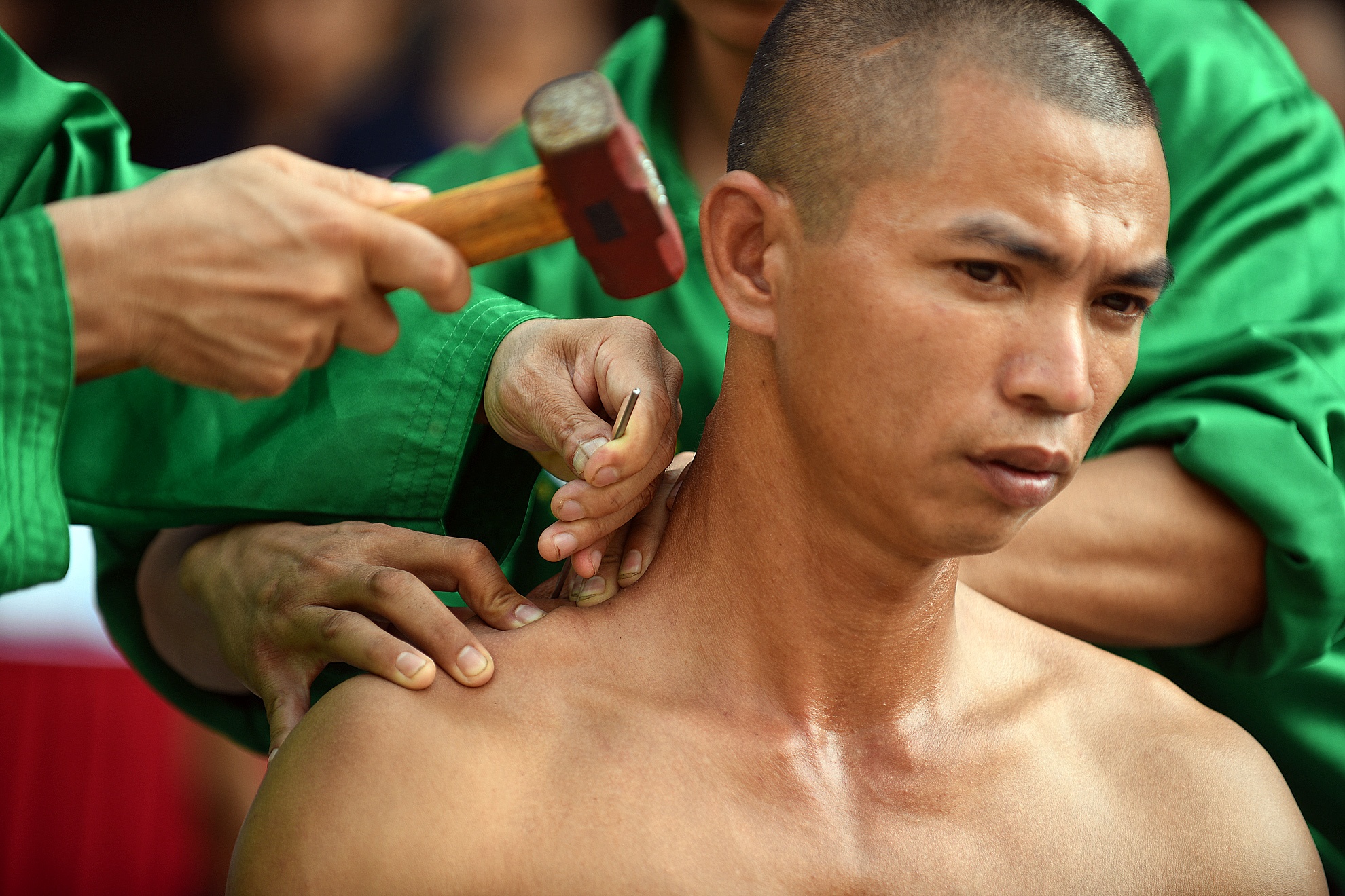| Mất khoảng 15 phút để võ sư vận nội công, đóng đinh vào vai để không chảy máu. Theo tiết lộ của võ sư Tuấn, người luyện nội khí công tốt sẽ biểu diễn được tiết mục này. "Tôi đã hạ thấp thân nhiệt, nhịp mạch hơn người bình thường. Khi mạch hạ, máu đưa ra các mao mạch hạn chế, chính vì thế khi đóng đinh vào người không bị chảy máu", vị võ sư nói. |