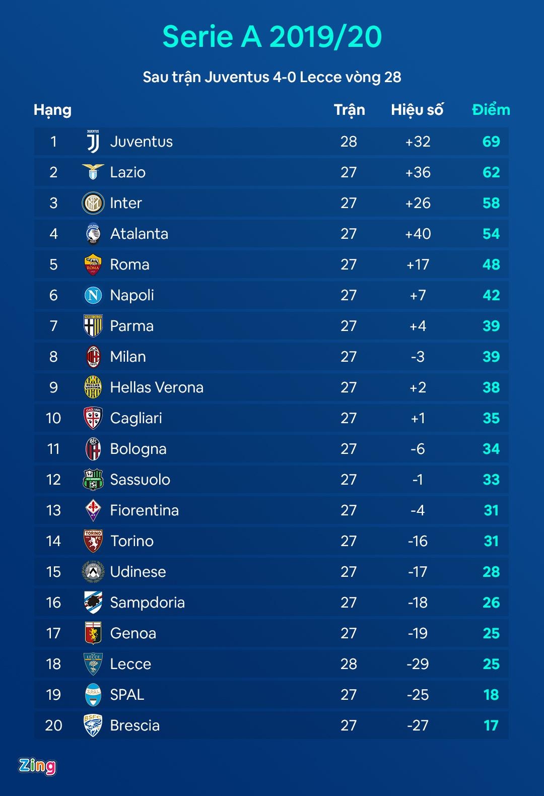 Màn trình diễn ấn tượng của Ronaldo cùng cú ngã của 2 đối thủ cạnh tranh giúp Juventus có cơ hội lớn để bảo vệ chức vô địch Serie A ở mùa giải năm nay. Sau trận đấu với Lecce ở vòng 28, khoảng cách giữa "Lão phu nhân" và Lazio tạm gia tăng thành 7 điểm.