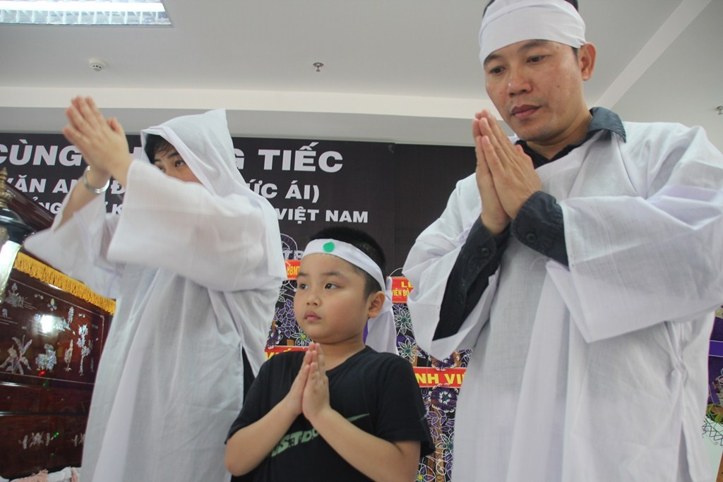 | Anh Trương A Hòa (con rể), chị Bùi Thị Hạnh Quyên (con gái nhà văn) và cháu ngoại cảm tạ những vị khách đến viếng.