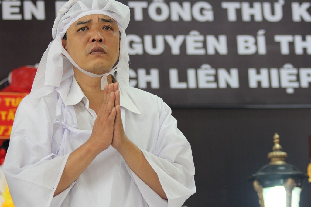 | Người con trai cả Bùi Đức Huy nghẹn ngào trong tang lễ cha mình. Nhà văn Anh Đức có tất cả 2 người con, một trai, một gái. |