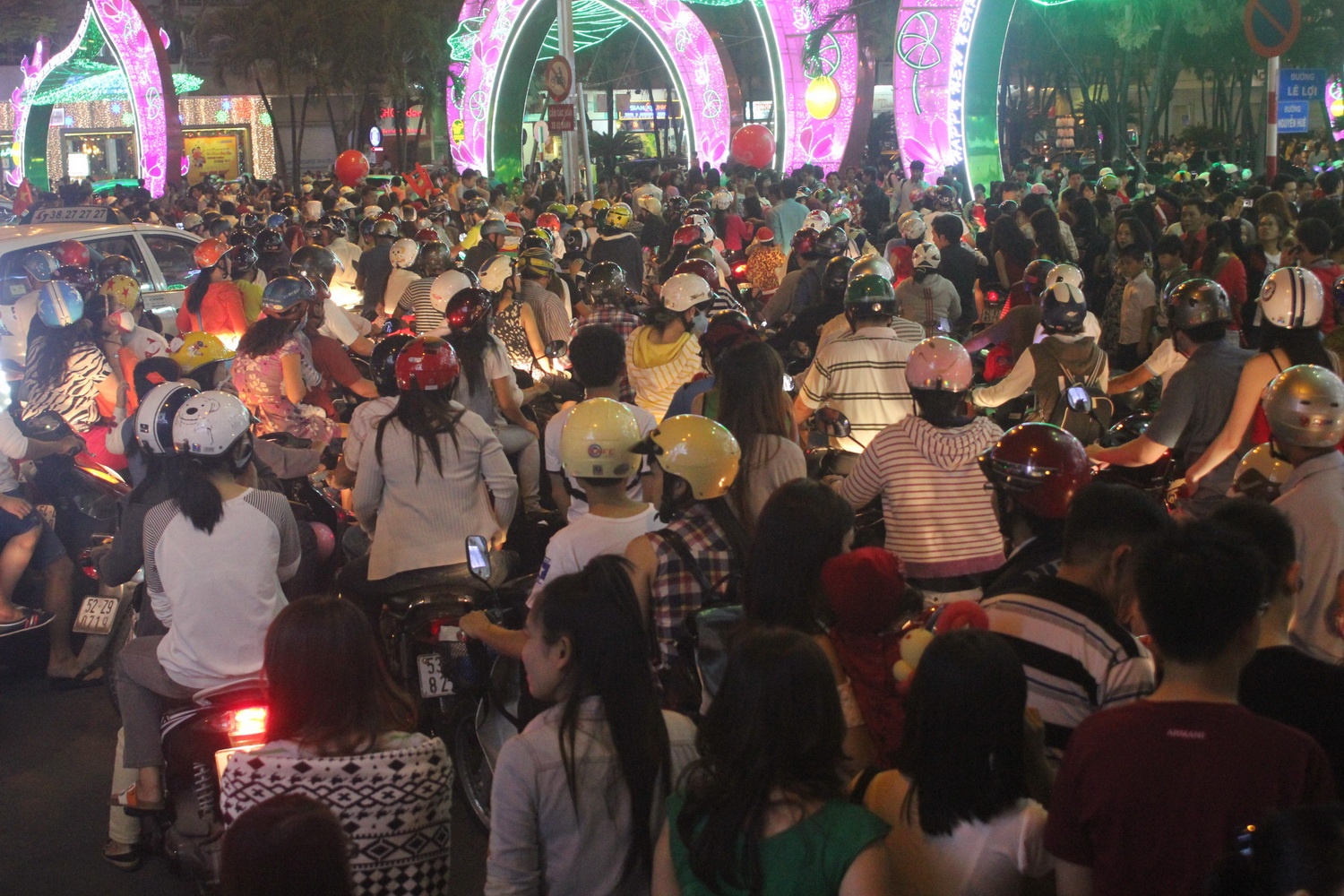 | Đến khoảng 20h, từng dòng người đổ về các tuyến đường như Lê Lợi, Nguyễn Huệ, Nam Kỳ Khởi Nghĩa...(Q.1) khiến giao thông bị dồn ứ. |