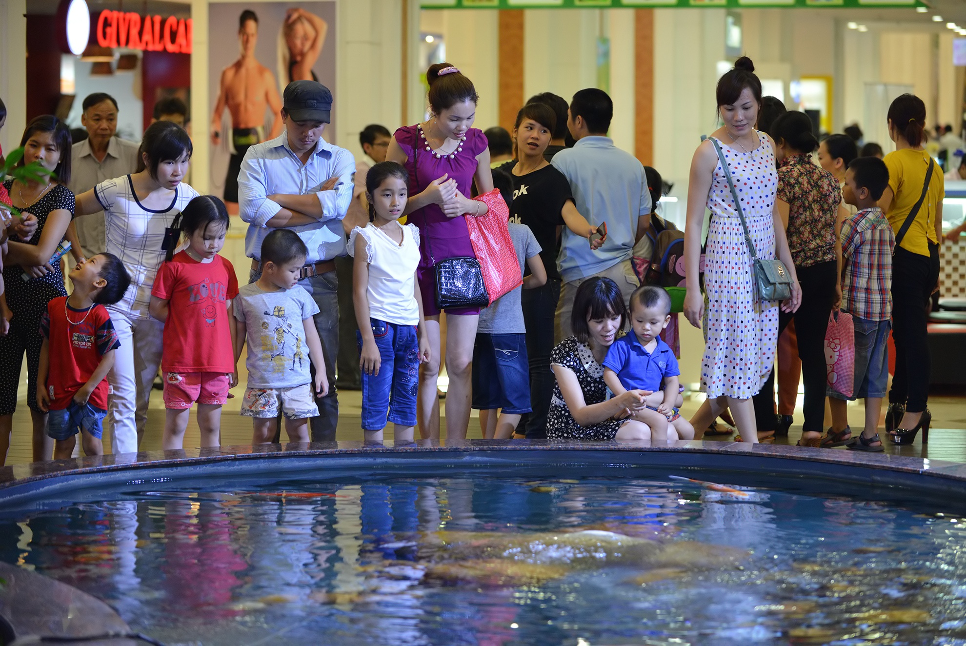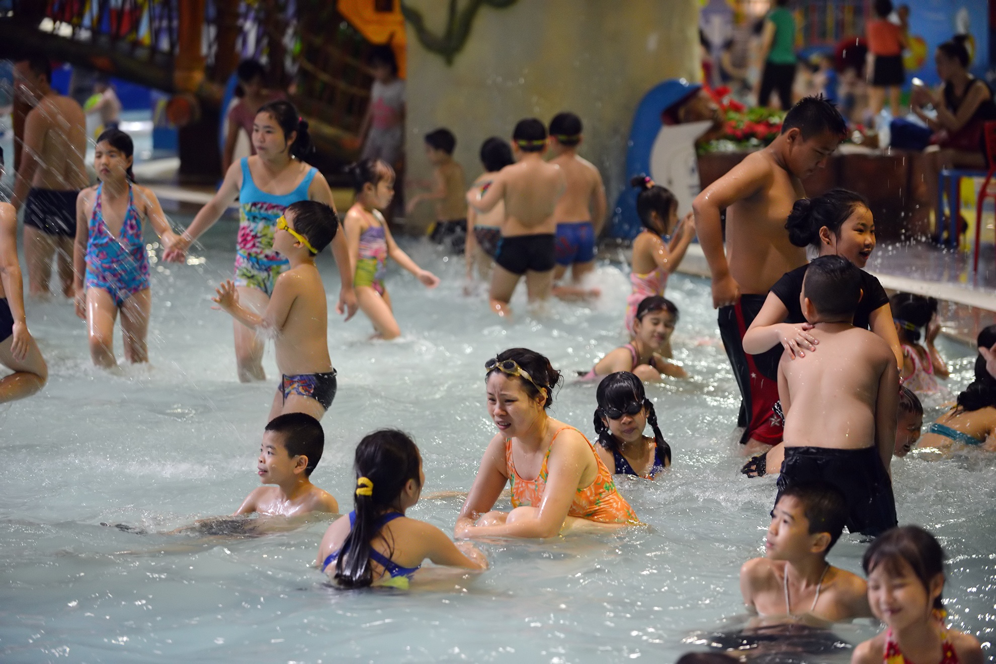 Tránh nắng nóng lên tới gần 40 độ C, nhiều gia đình đưa con đến khu mua sắm dưới lòng đất vào chiều muộn 1/6. Hơn 20h, bể bơi, sân băng, khu trò chơi vẫn đông nghịt.
