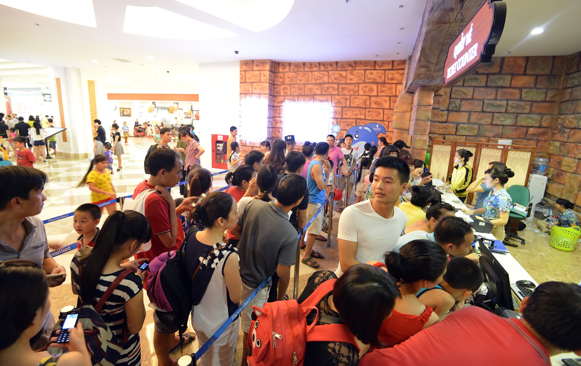 Công viên nước, rạp chiếu phim, quán ăn... tại Trung tâm thương mại Royal City trên đường Nguyễn Trãi (Hà Nội) là điểm đến của nhiều người trong ngày Quốc tế thiếu nhi. Nhiệt độ ngoài trời xấp xỉ 40 độ C là nguyên nhân khiến khu vực bán vé vào công viên nước luôn trong tình trạng ùn ứ.