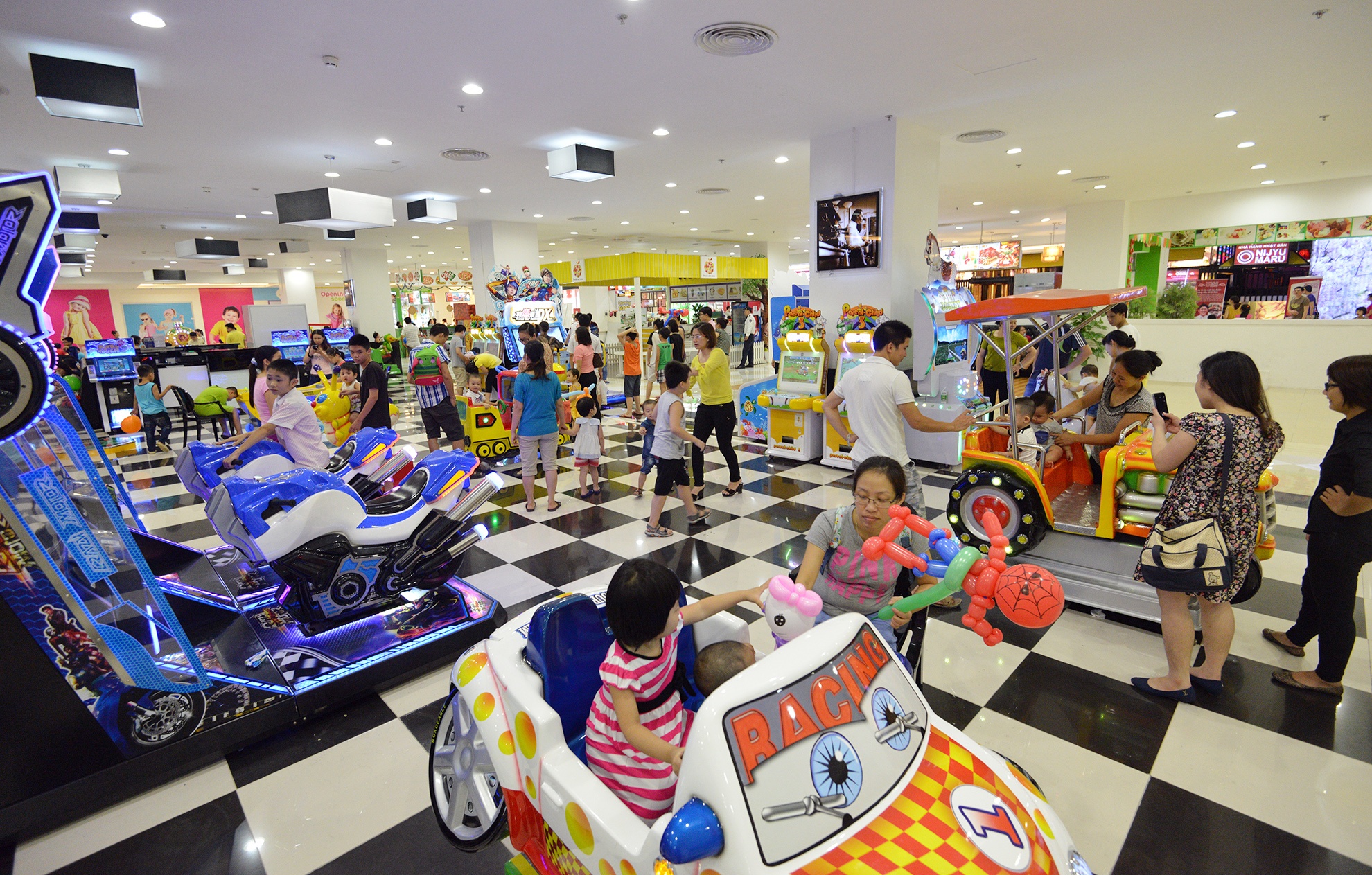 | Năm nay, nhiều gia đình đưa con đi chơi 1/6 muộn, một phần để tránh thời tiết nóng bức của ban ngày, phần vì dịp này rơi vào Chủ nhật. 20h, không khí vui chơi tại các trung tâm thương mại vẫn náo nhiệt không kém ban ngày.