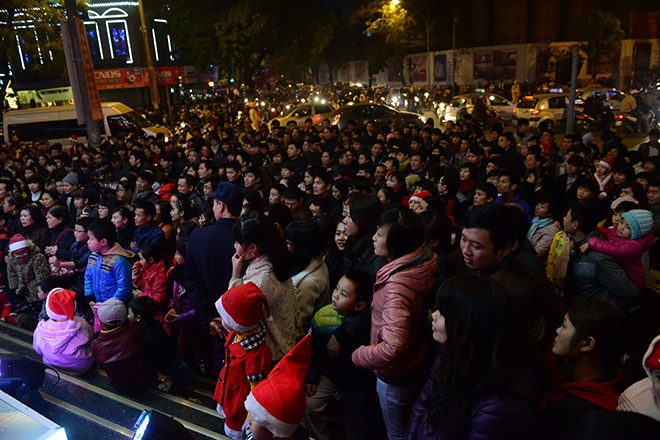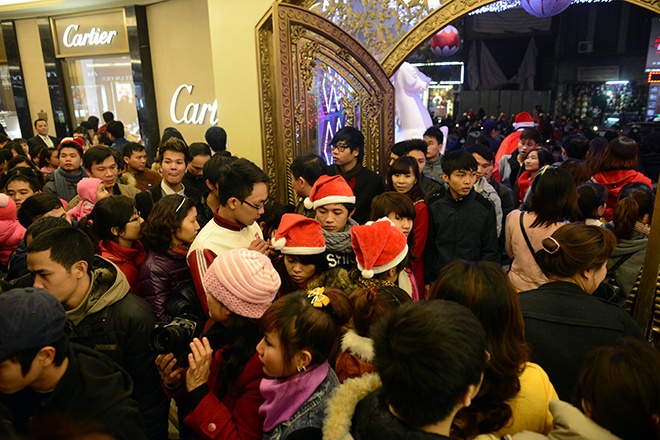| Tối Noel, biển người đổ về trung tâm Hồ Gươm khiến khu vực này quá tải, đặc biệt là địa điểm của Tràng Tiền Plaza - khu mua sắm xa xỉ nhất thủ đô. |