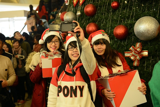 | Tràng Tiền Plaza trở thành một "công viên chụp ảnh" lớn vào tối Noel. |