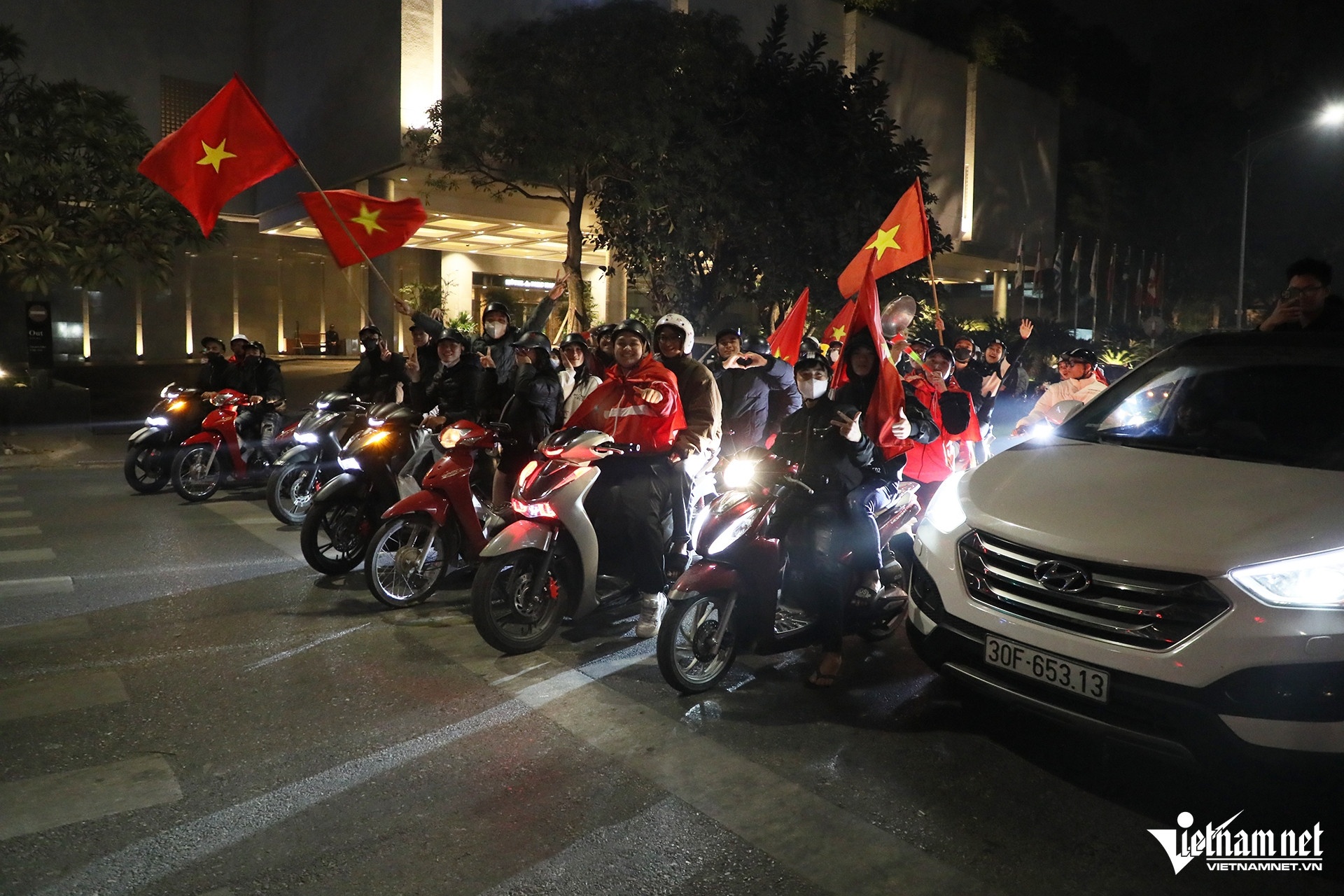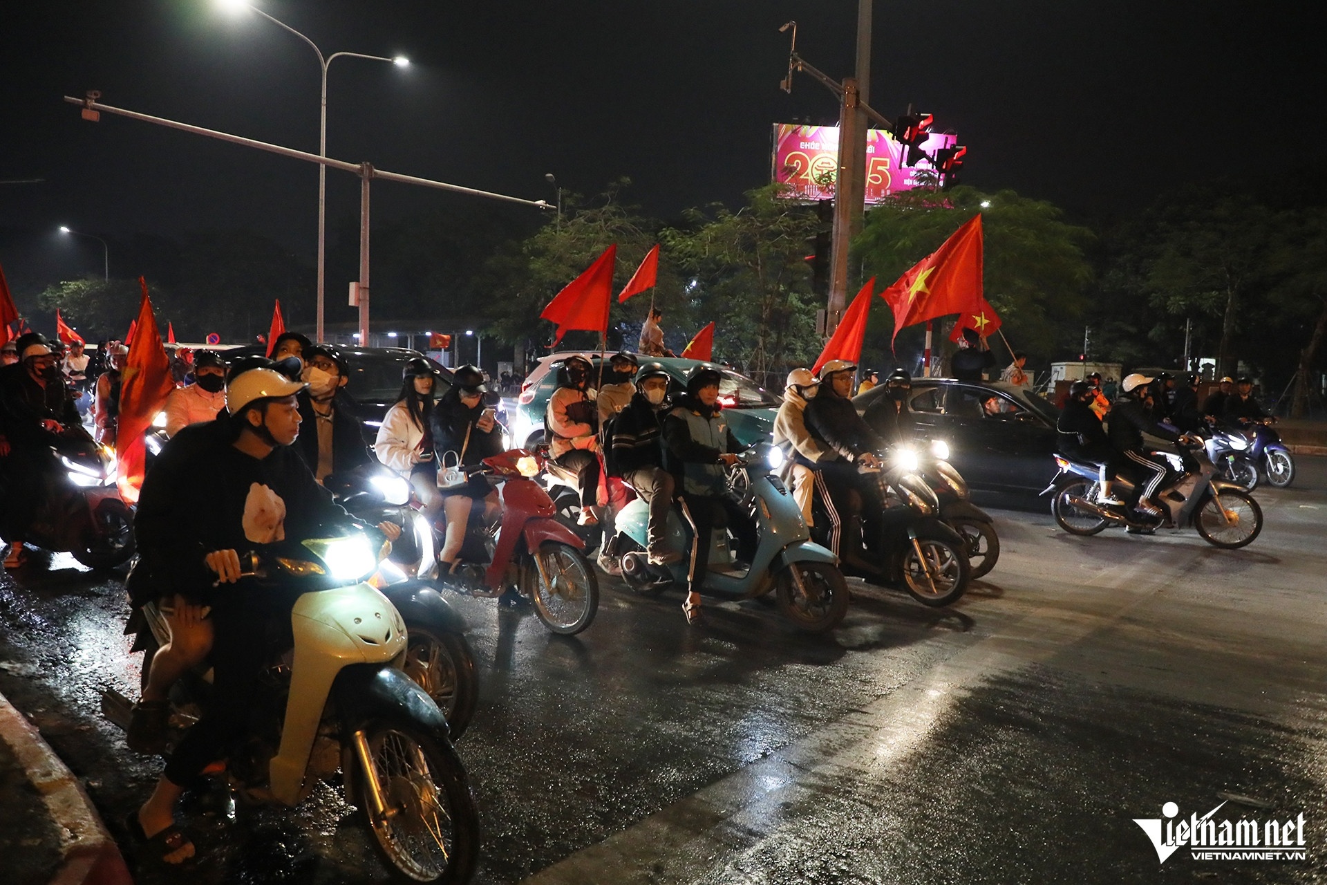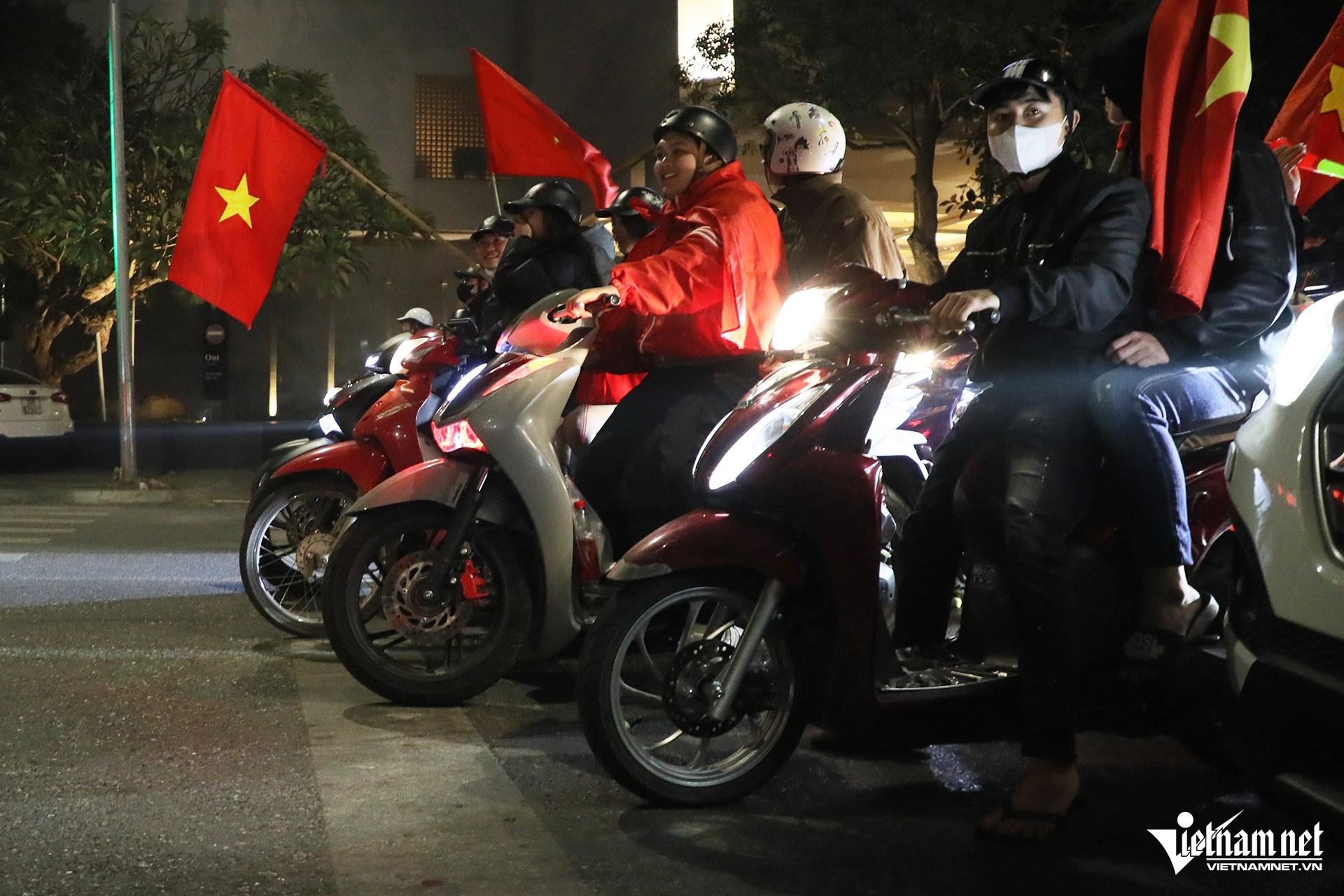 Đáng chú ý, dù đang say trong niềm vui chiến thắng nhưng dòng người xuống đường ăn mừng vẫn dừng chờ đèn đỏ, ngay ngắn thẳng hàng. Tại nút giao Lê Đại Hành - Đại Cồ Việt (quận Hai Bà Trưng), nhiều phương tiện dừng chờ đúng nhịp đèn đỏ.