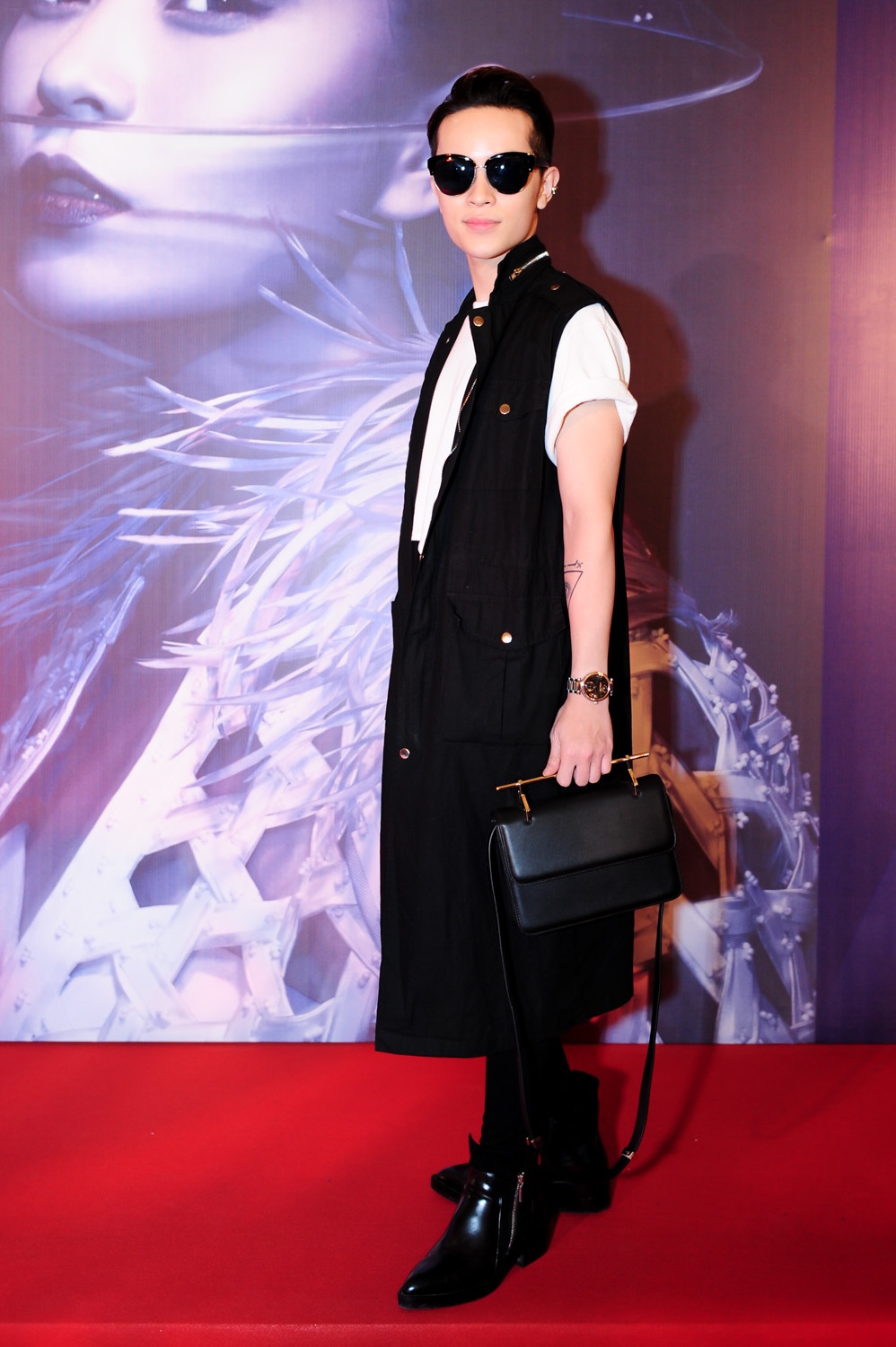 | Stylist Kelbin Lei phá cách với trang phục unisex, tông màu trắng đen. |
