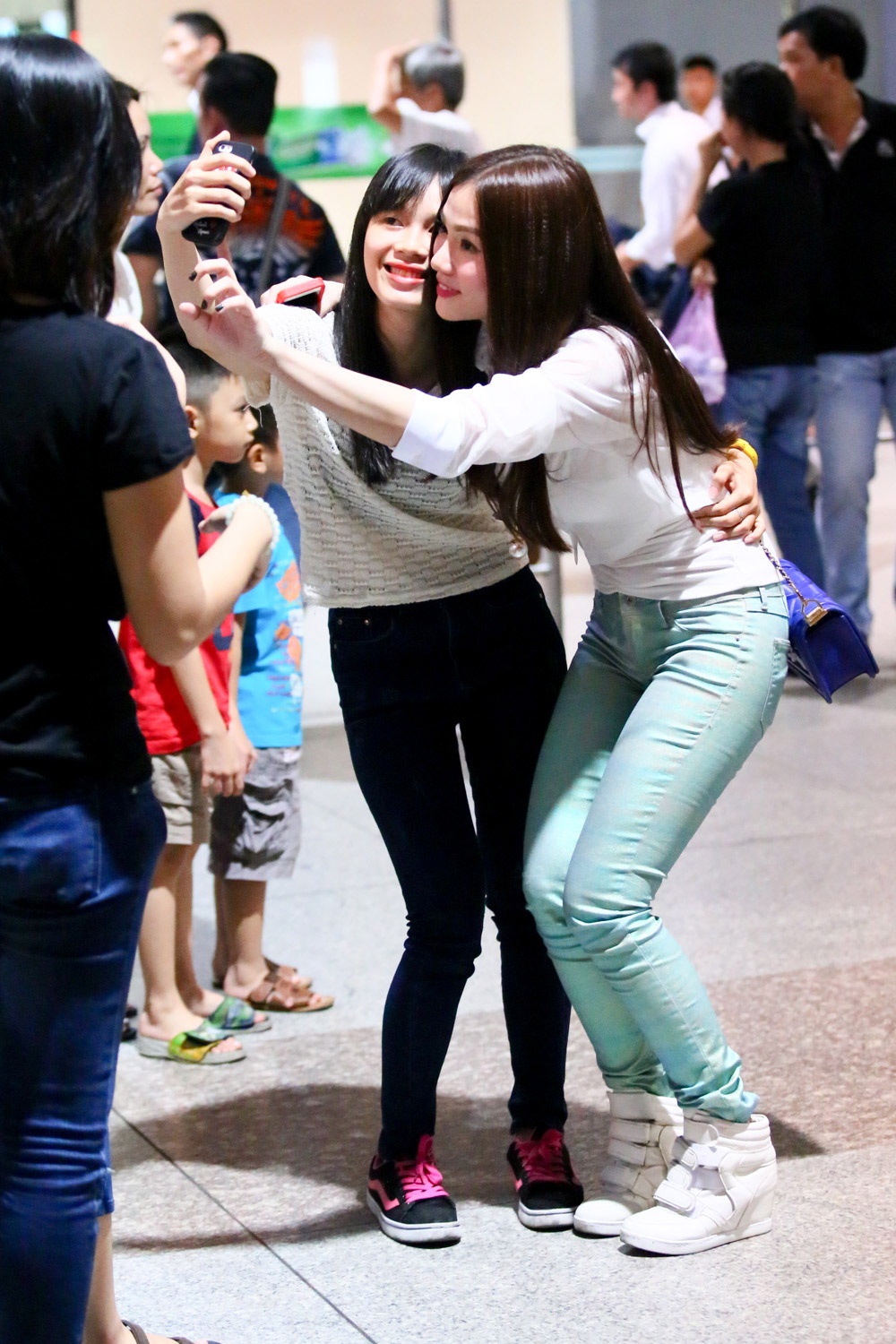 | Thu Thủy cởi mở, thân thiện khi được một khán giả trẻ phát hiện và xin chụp hình lưu niêm tại sân bay. |