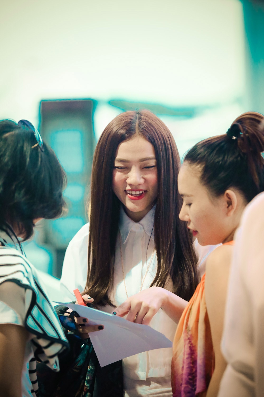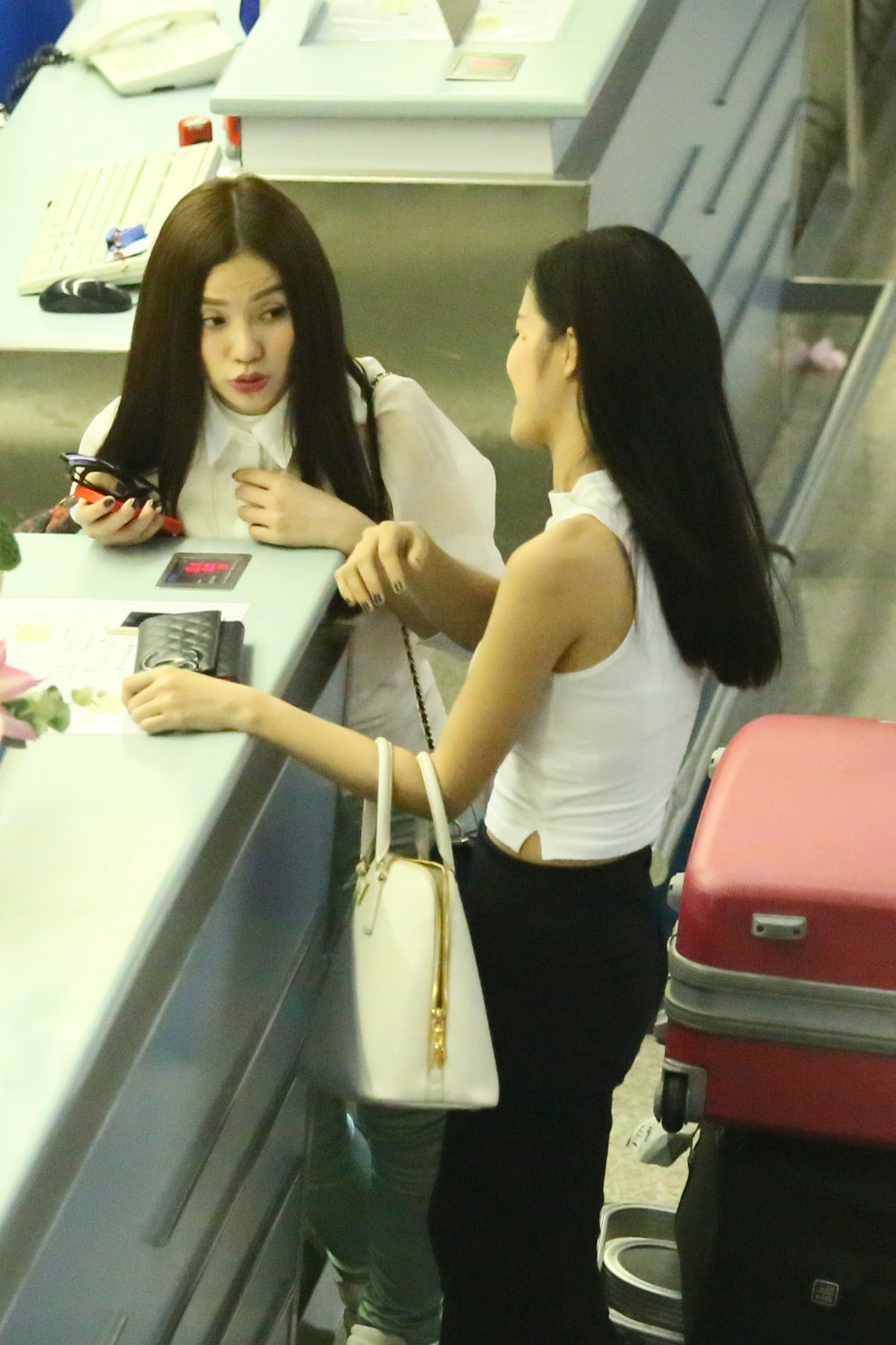 | Đông Nhi tươi tắn khi hội ngộ đàn chị Thu Thủy tại quầy thủ tục. Cả 3 ca sĩ đều có chuyến lưu diễn tại Úc trong thời gian này. |