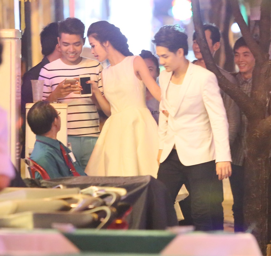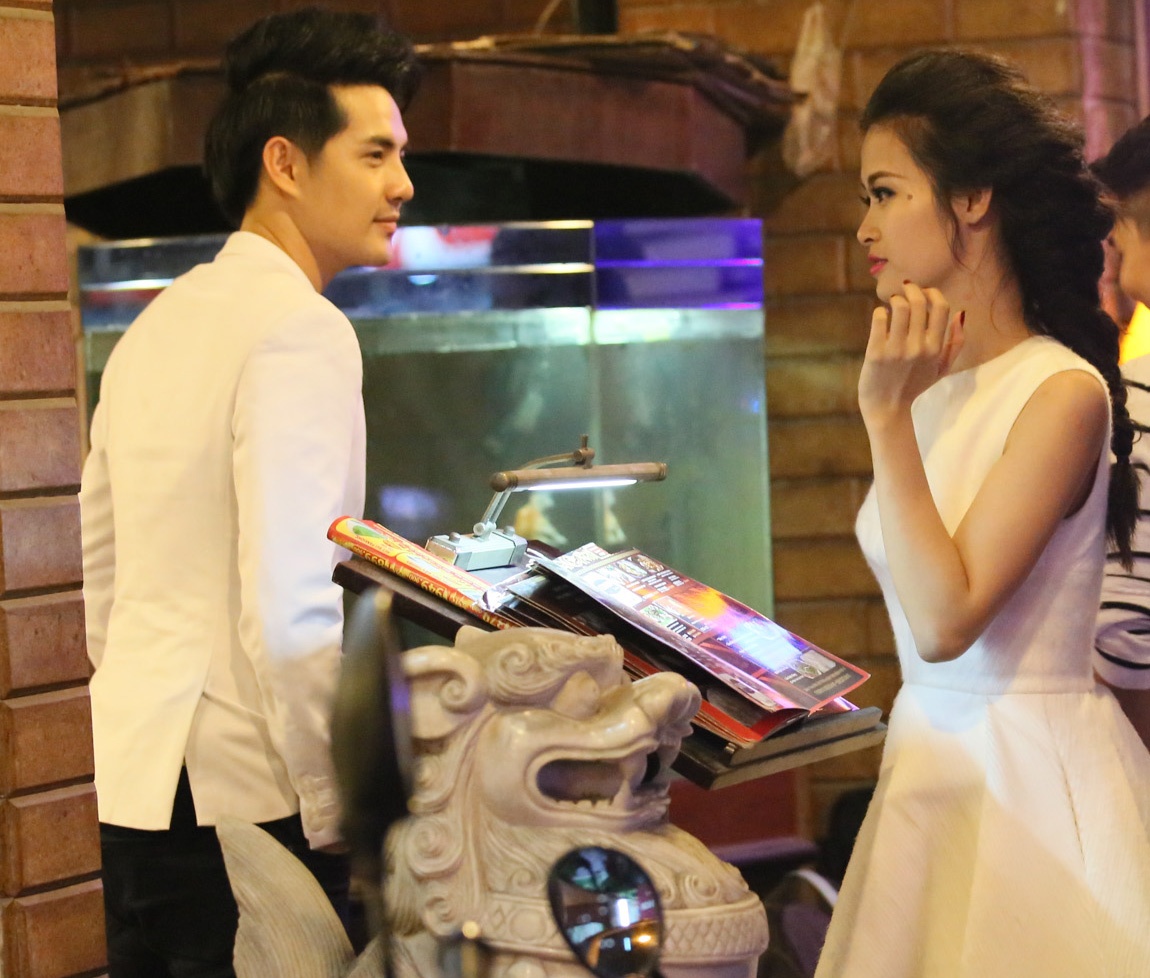 | Cả hai đi bộ đến một quán đồ nướng. Kể từ khi công khai hẹn hò, sự nghiệp ca hát của nam ca sĩ Ông Cao Thắng cũng tiến triển tốt đẹp. Cả hai sở hữu lượng fan chung lớn, các dự án âm nhạc thường có sự hỗ trợ của người yêu. |