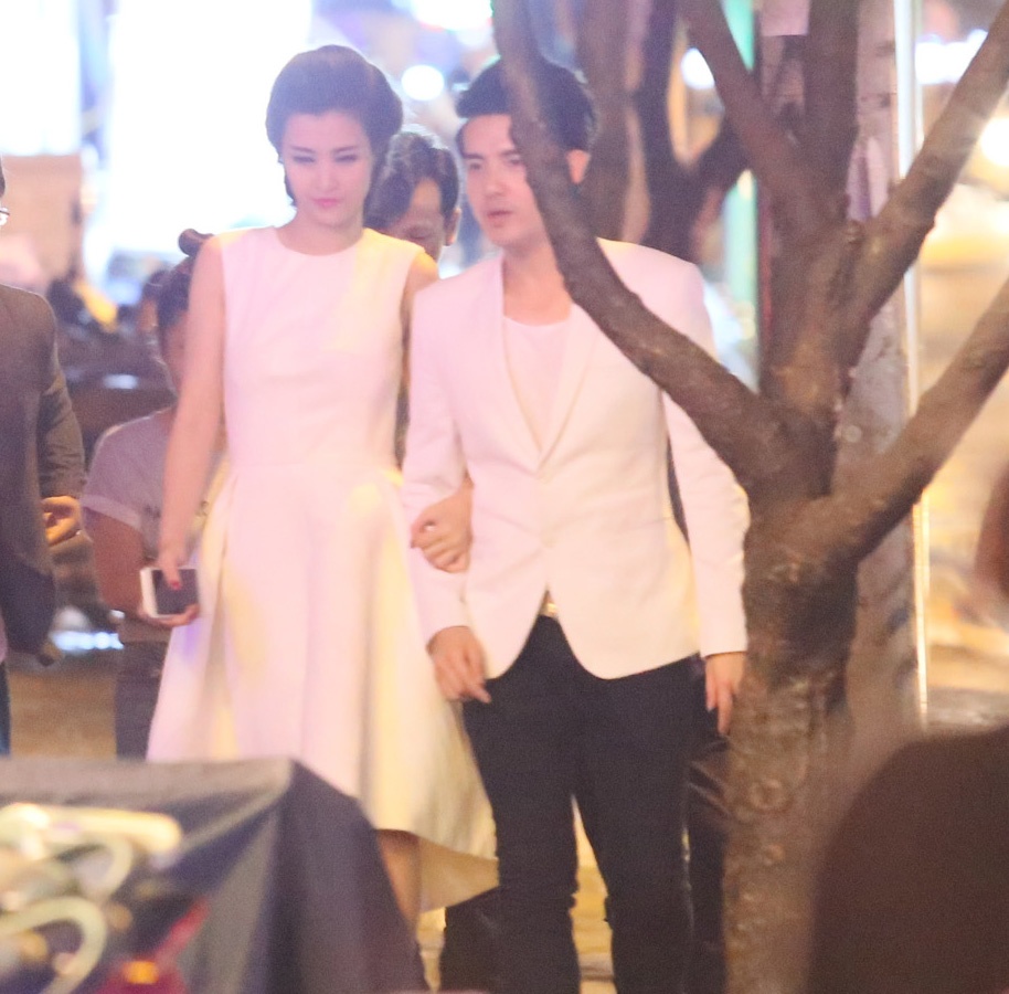 Tối 20/12, cặp trai tài gái sắc đi bộ đến một quán ăn đồ nướng sau khi tham gia sự kiện lễ trao giải Làn sóng xanh tại TP.HCM.