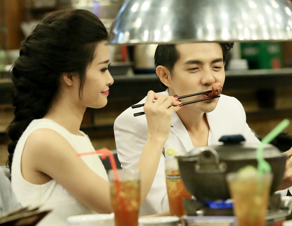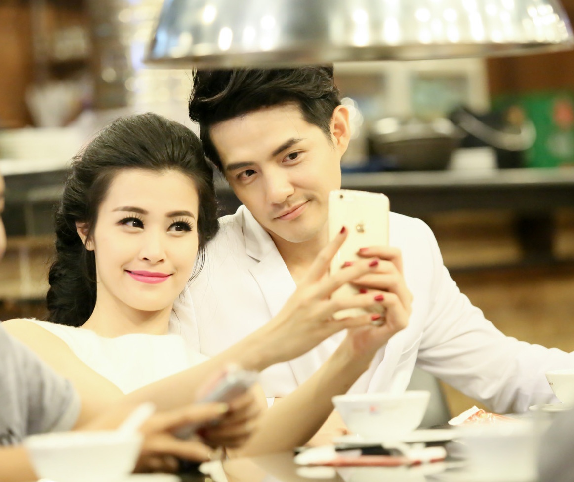 | Cặp đôi tranh thủ chụp hình bằng điện thoại trong khi chờ đồ ăn. Nữ ca sĩ luôn tự hào về bạn trai, cô nói: "Đối với tôi, anh Thắng là một người chín chắn, biết suy nghĩ cho tương lai và luôn vạch ra những mục tiêu trong cuộc sống. Bề ngoài có vẻ ít nói, lạnh lùng nhưng thật ra Thắng có một trái tim rất ấm áp”. |