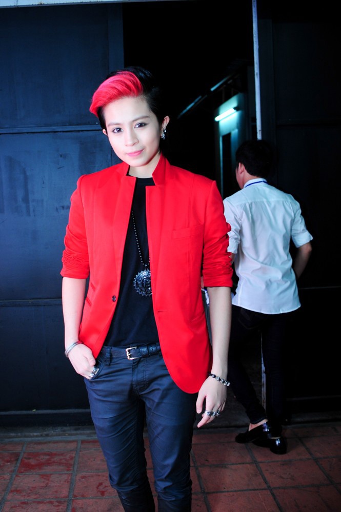 | Gil Lê diện áo đỏ ton sur ton với màu tóc. |