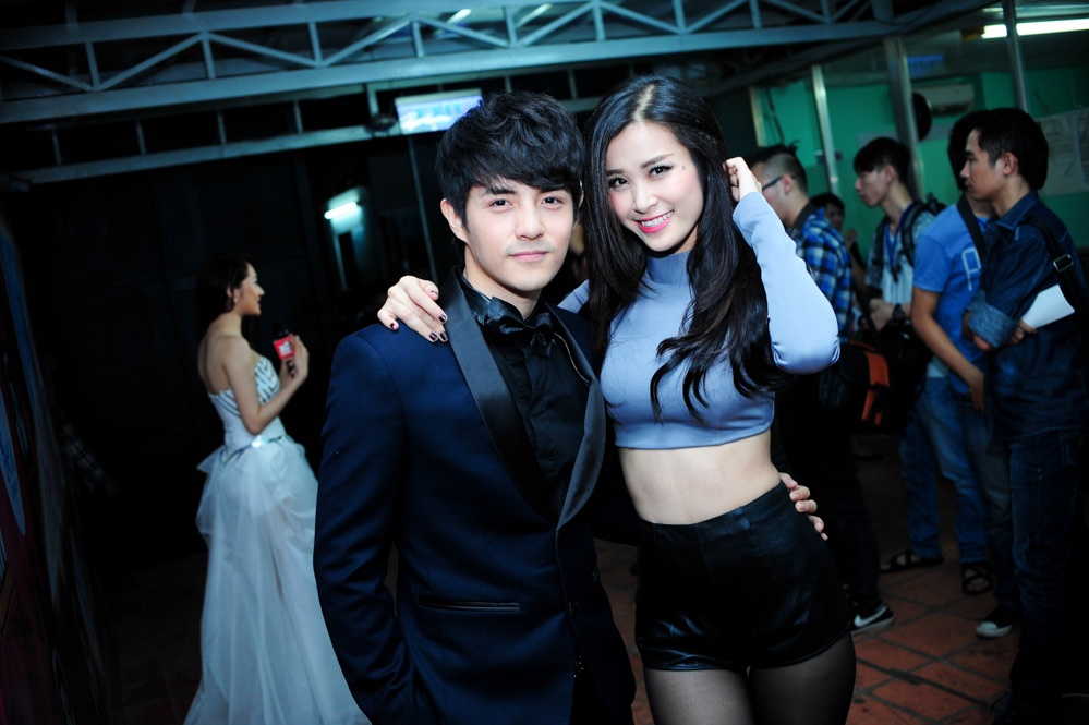 | Noo Phước Thịnh giúp Đông Nhi chuẩn bị phụ kiện trước giờ biểu diễn. |